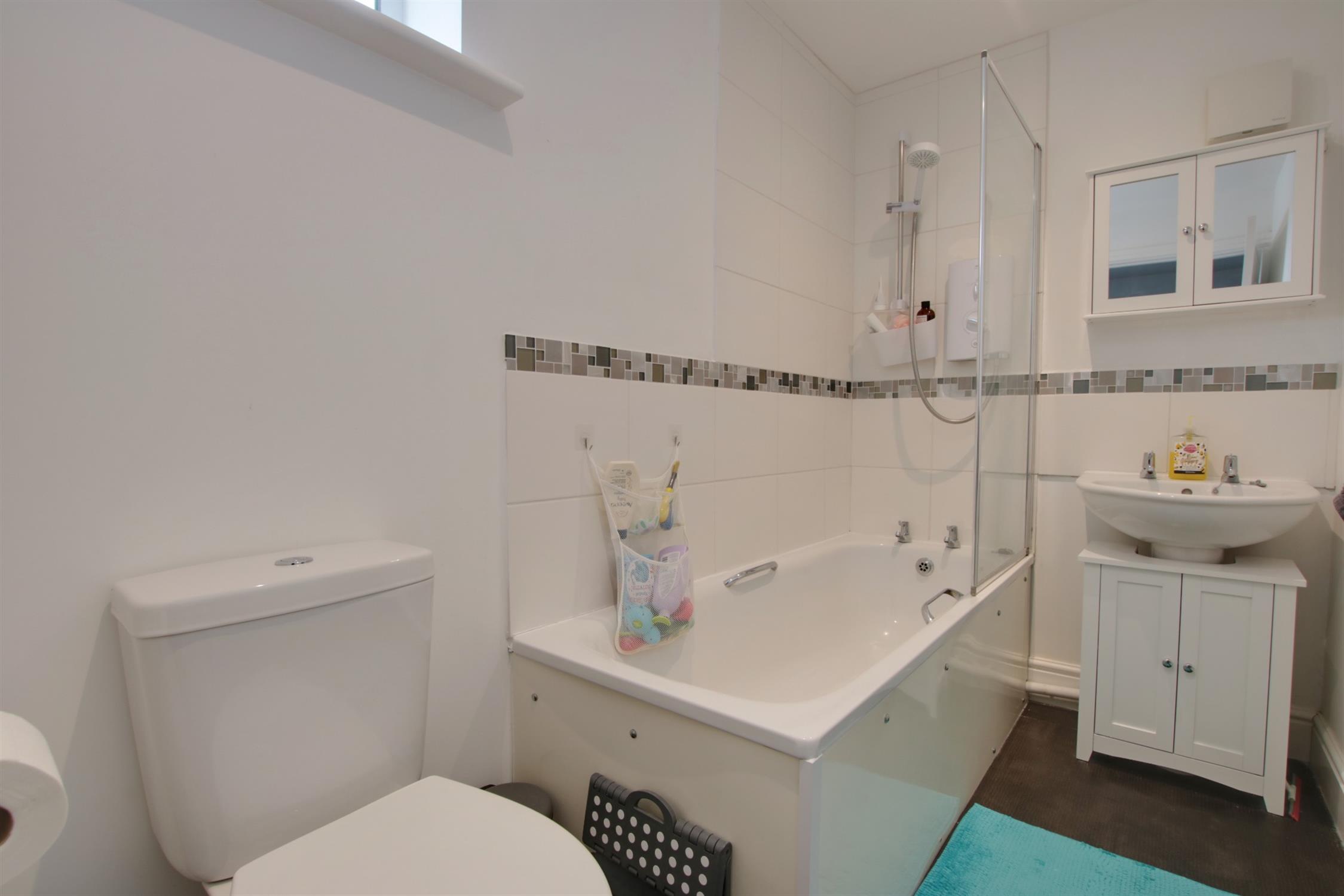 Double glazed window to the rear aspect. Smooth ceiling with inset spotlighting. Extractor fan. Modern suite comprising; bath with ‘Mira’ shower over and screen, wash hand basin and low level WC. Part tiled walls. Heated towel rail. Vinyl flooring.