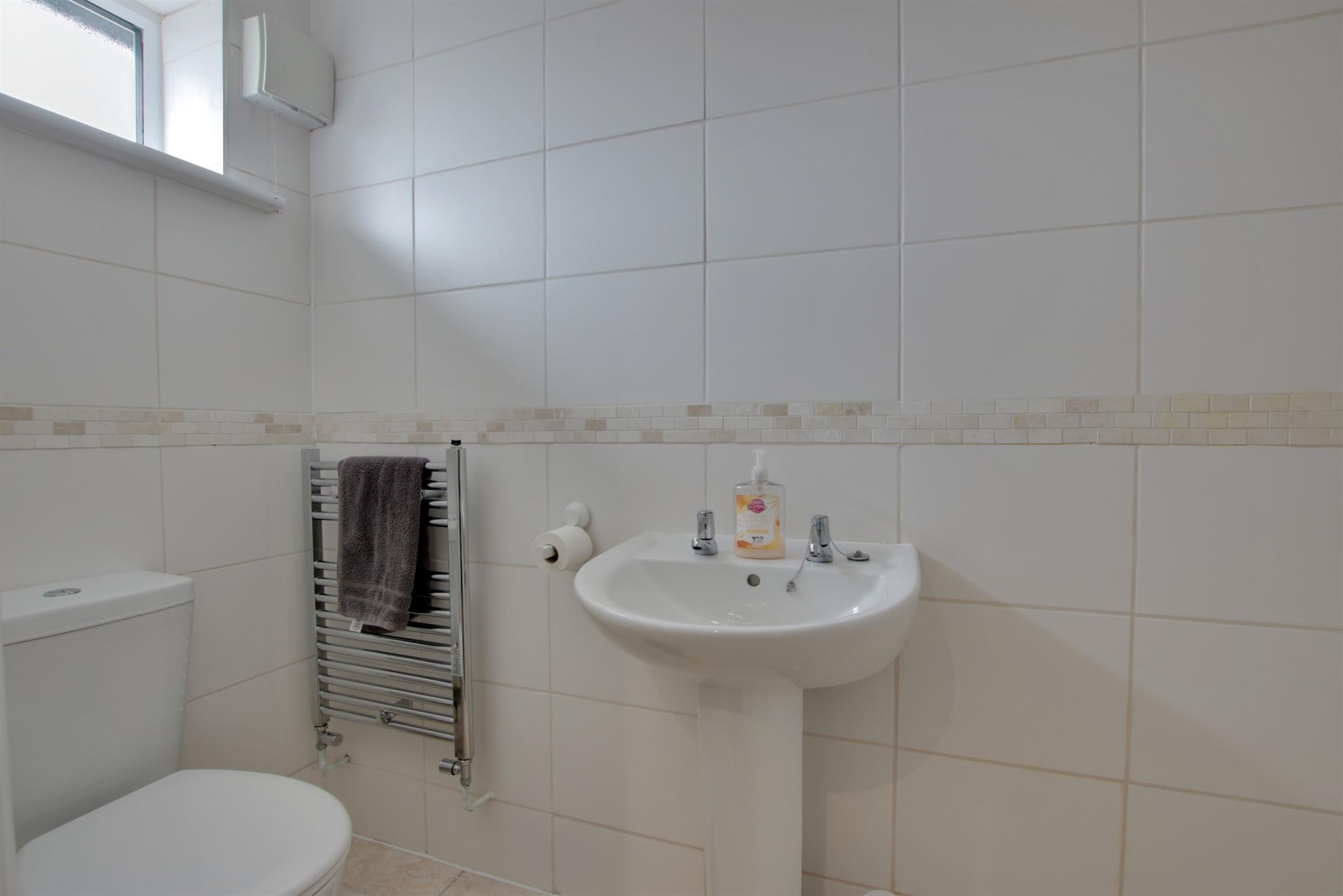 Double glazed window to the front aspect. Smooth ceiling with inset spotlighting. Extractor fan. Low level WC and wash hand basin. Space for washing machine and dryer. Radiator. Continuation of the flooring from the porch area.