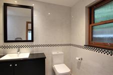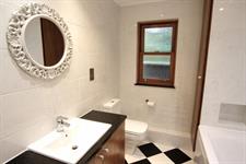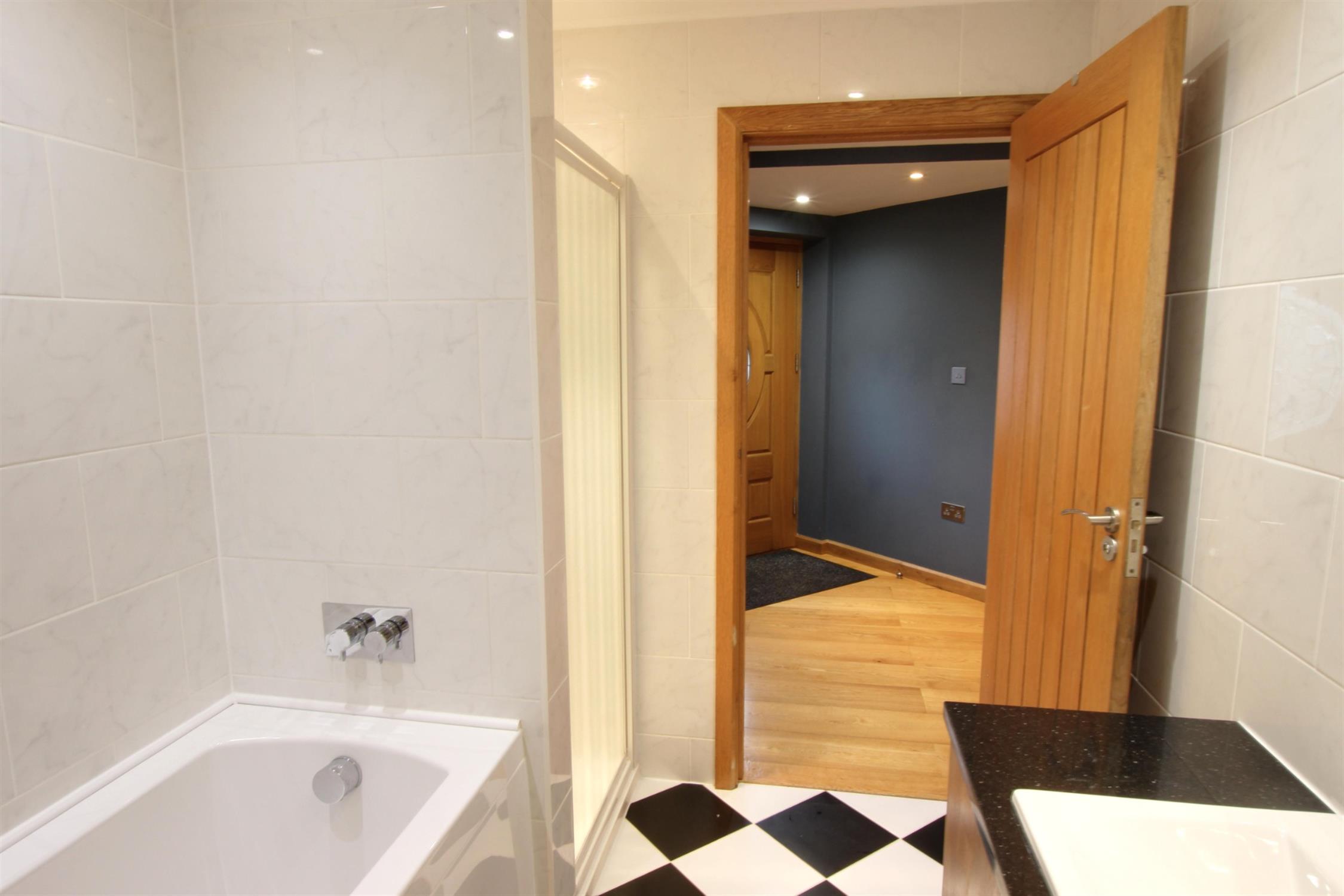 BATHROOM: Modern family bathroom with underfloor heating comprising a bath with built in shelf to the tiles, separate shower cubicle with rain shower head, WC, wash basin with vanity unit, vertical sliding window and a built in storage cupboard for added convenience.