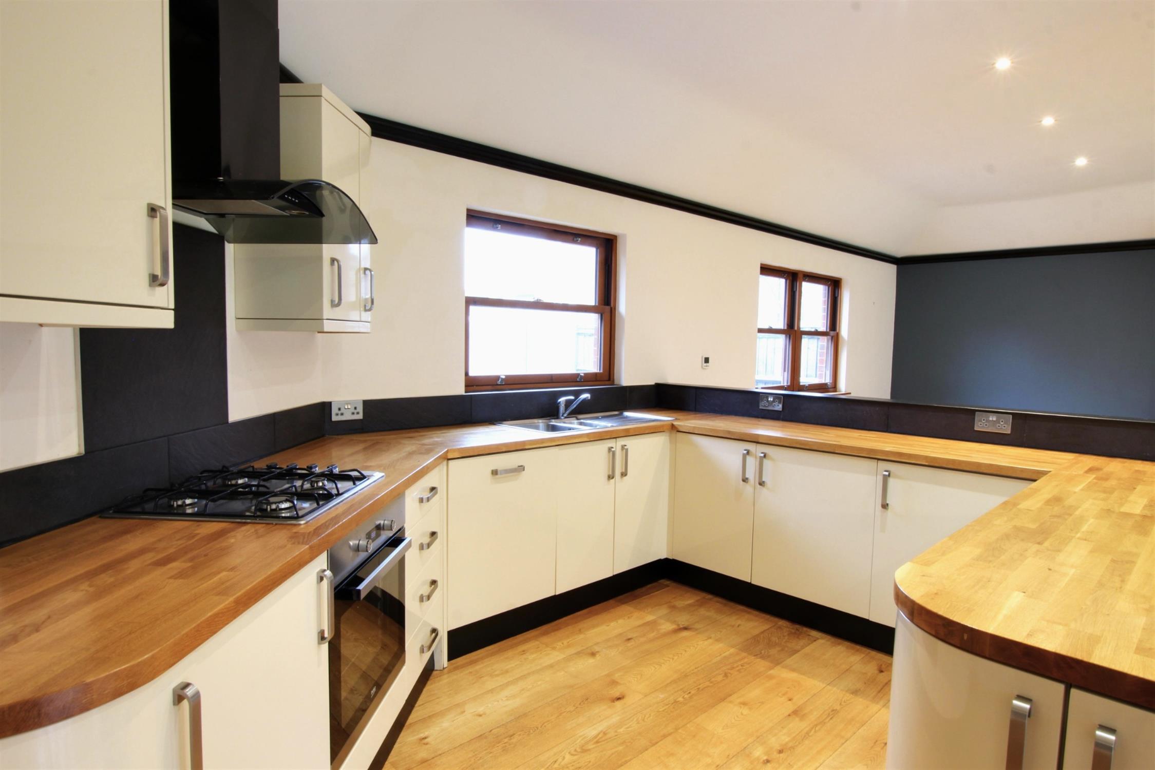 KITCHEN: Modern high gloss fitted kitchen offering ample storage and workspace, stainless steel sink with drainer complete with an integrated dishwasher, optional fridge freezer and vertical sliding windows.