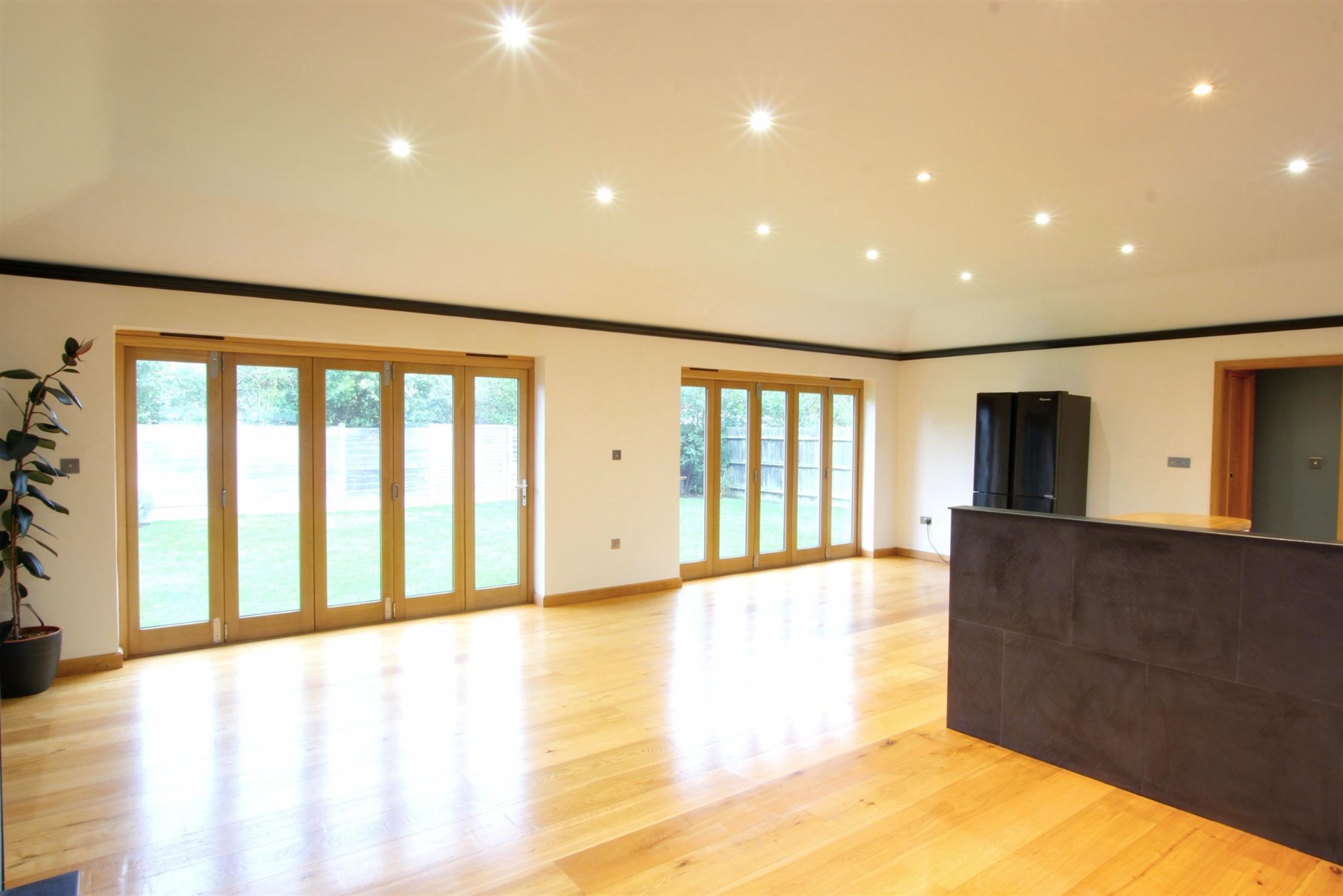 LOUNGE: A modern and welcoming open-plan living space, vertical sliding windows, a log burner and underfloor heating for warmth and bi-folding doors opening up to the rear garden