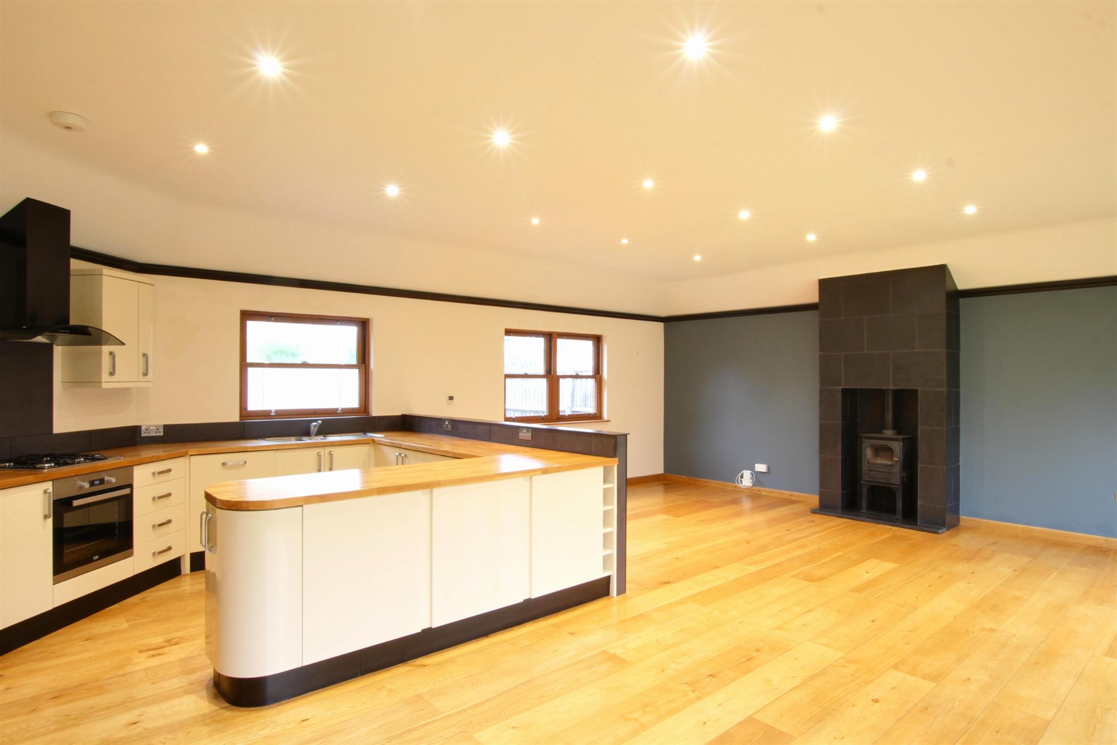 The heart of the property is a high-gloss kitchen with an integrated dishwasher and optional fridge freezer, whilst a dedicated cupboard in the hallway offers space for a washing machine. The spacious open-plan living area is enhanced with a log burner for warmth and bi-folding doors for access onto the low-maintenance garden.
