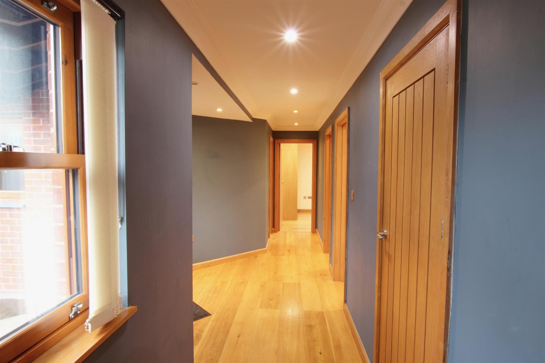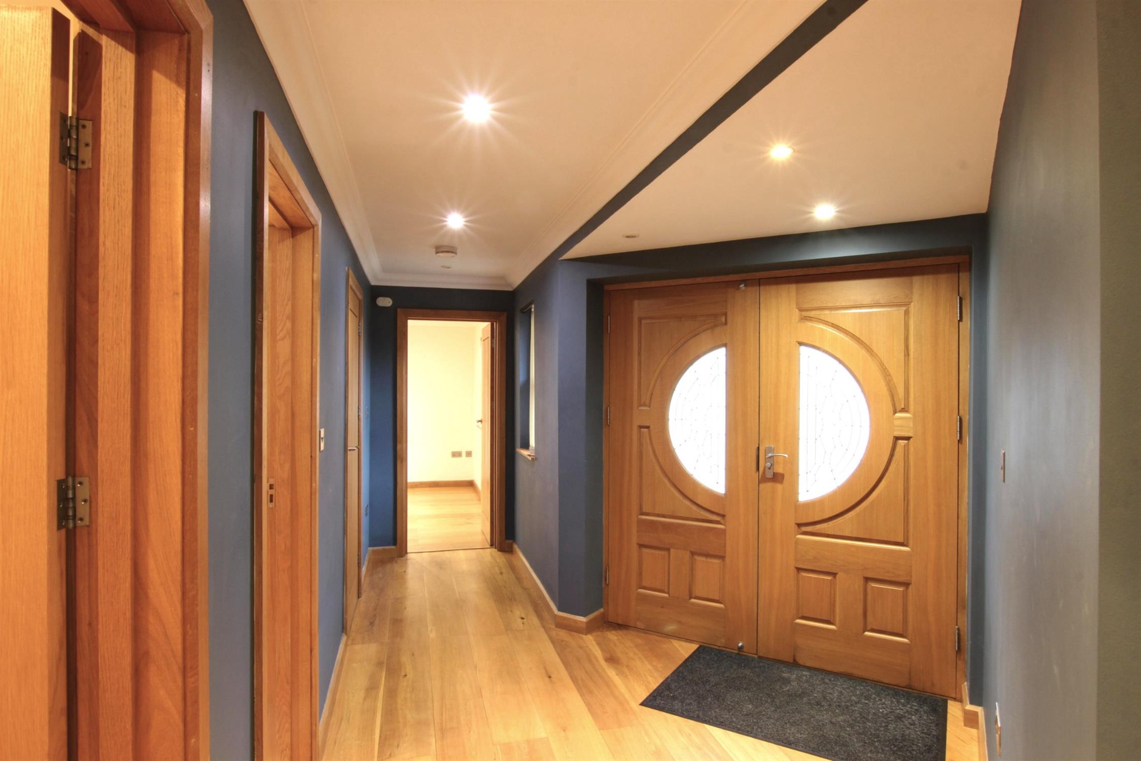 ENTRANCE: Impressive double entrance doors, spacious entrance hallway provides access to all rooms and features oak flooring with underfloor heating, vertical sliding window and a useful storage cupboard housing the boiler and space for a washing machine