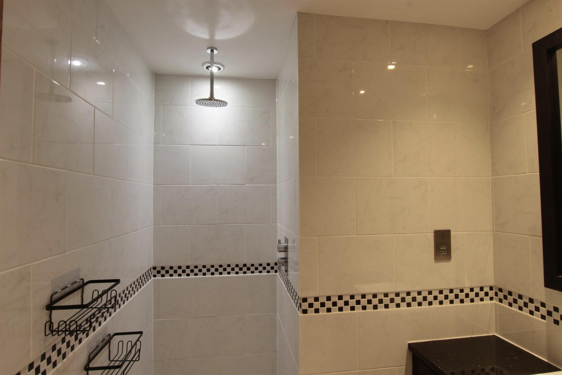 EN SUITE: Stylish and modern wet room with underfloor heating featuring a walk in shower with rain head, WC, wash basin with vanity unit and vertical sliding window.