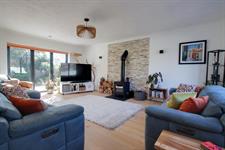 The principal living room is well-proportioned and has as its focal point a contemporary wood burning stove with contrasting granite tiling behind and slate hearth. There is oak flooring and double glazed aluminium windows to the front with aluminium bi-folding doors opening onto the rear garden. A wide opening leads to: