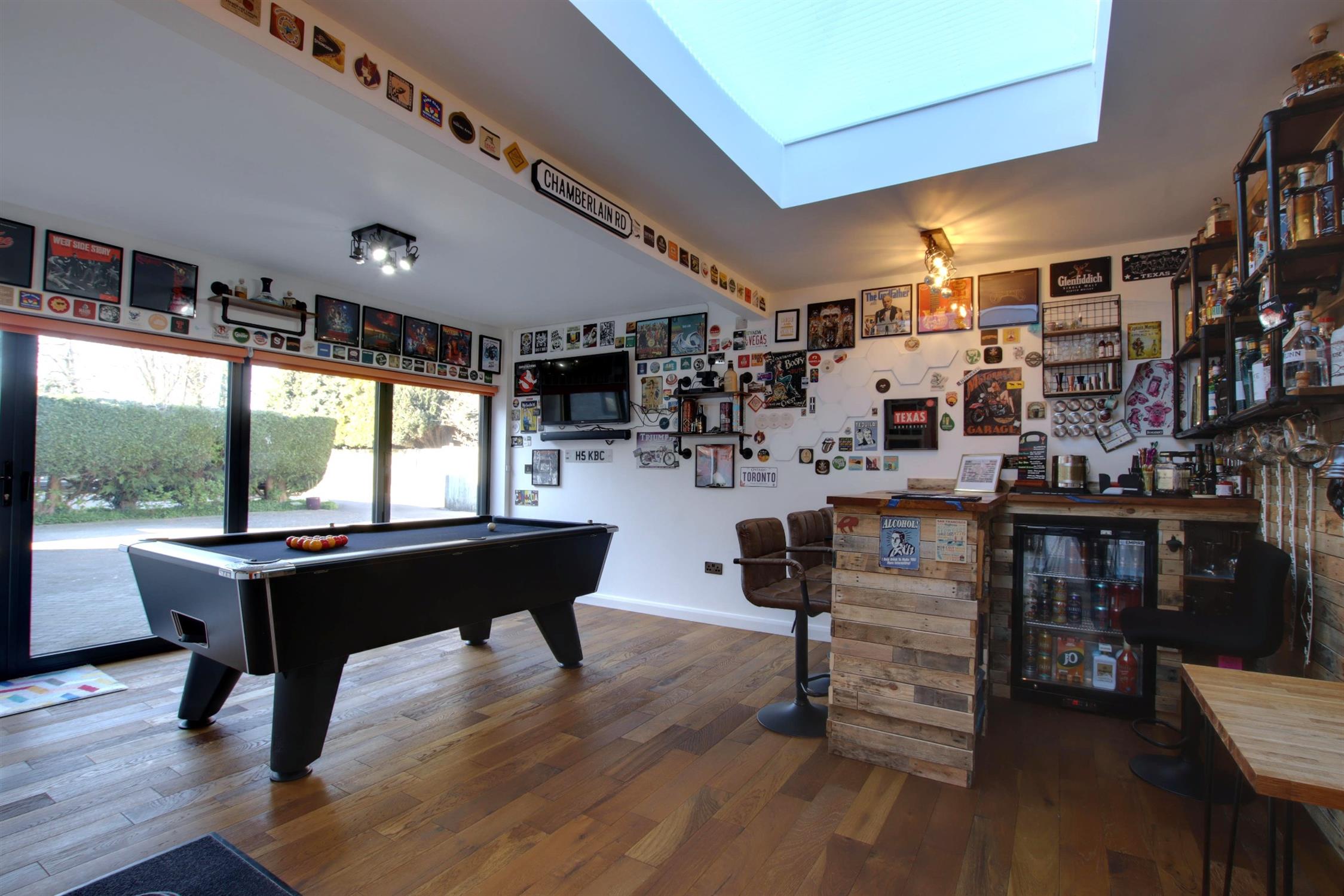 This wonderful lifestyle addition to the home provides a fun versatile space with large lantern window, bi-folding doors and a separate double glazed door leading to the rear garden. There is a fitted bar and attractive wood panelling to one wall. Fitted ceiling lights and electric wall heater.