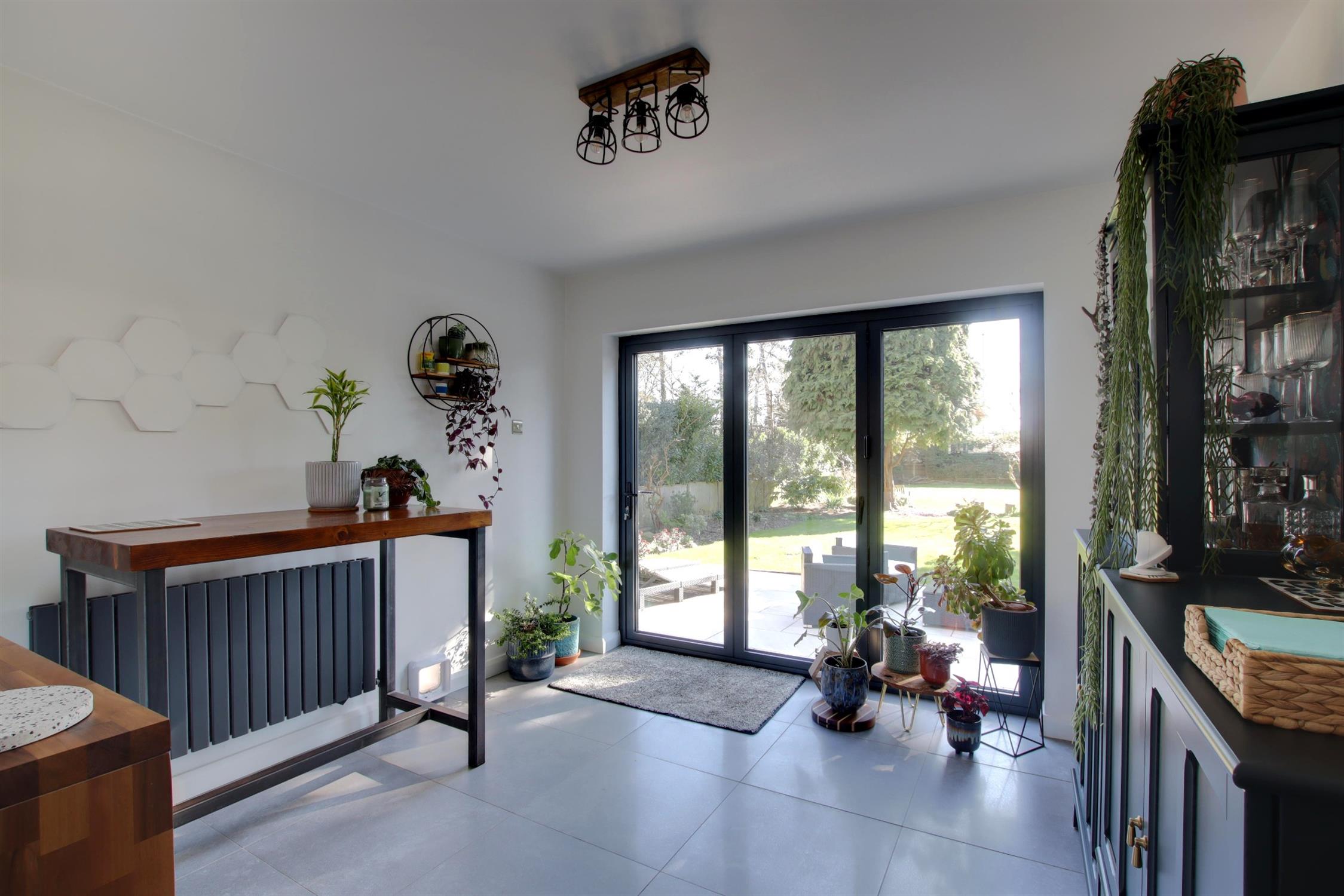 Matching oak flooring and anthracite radiator and a further set of aluminium double glazed bi-folding doors. A door provides access to the hall.