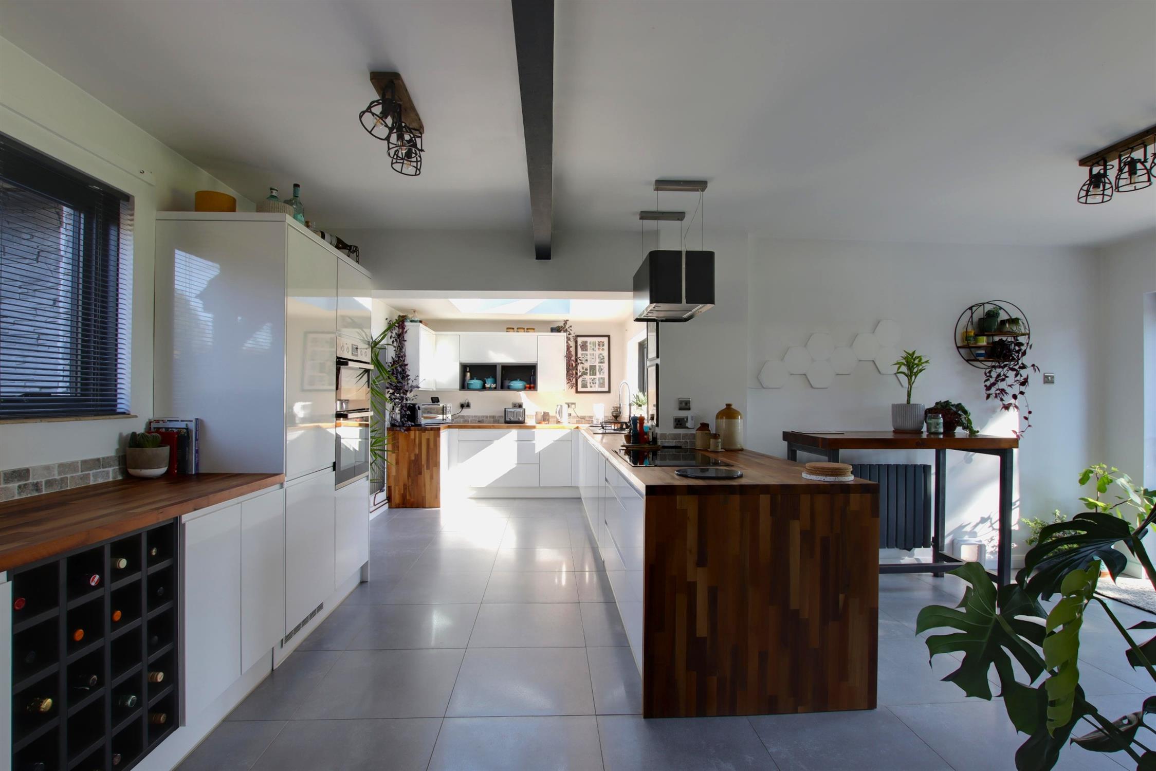This wonderful open plan space is the hub of the house with anthracite aluminium double glazed window to front elevation, a large roof lantern and aluminium bi-folding doors to rear, all of which allow light to flood into this wonderful living space. There are a comprehensive range of kitchen units including base cupboards with drawers and matching wall units. Walnut work tops with a one and a half bowl sink unit. Fitted wine rack. Integrated appliances include fridge/freezer, double electric oven and dishwasher. Concealed waste and recycling bins. Breakfast area with walnut breakfast bar and aluminium bi-folding doors opening onto the garden terrace. Two anthracite radiators. Door to: