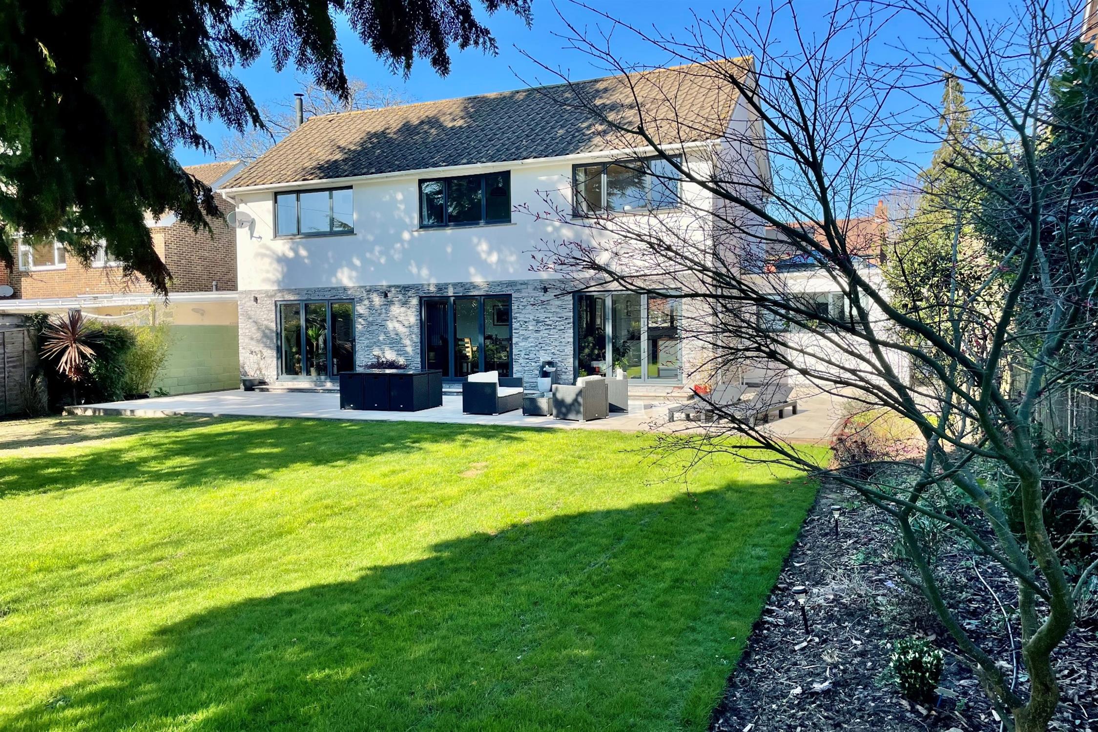 DESCRIPTIONSet within established gardens and grounds of approximately a quarter of an acre, is this impressive, detached house with well-designed open-plan living spaces providing the ideal home for modern family life. On entering the house, there is a generous reception hall opening into a modern refitted kitchen/breakfast room which is linked to a wonderful family room/games room with its own bar, large lantern roof window and bi-folding doors.