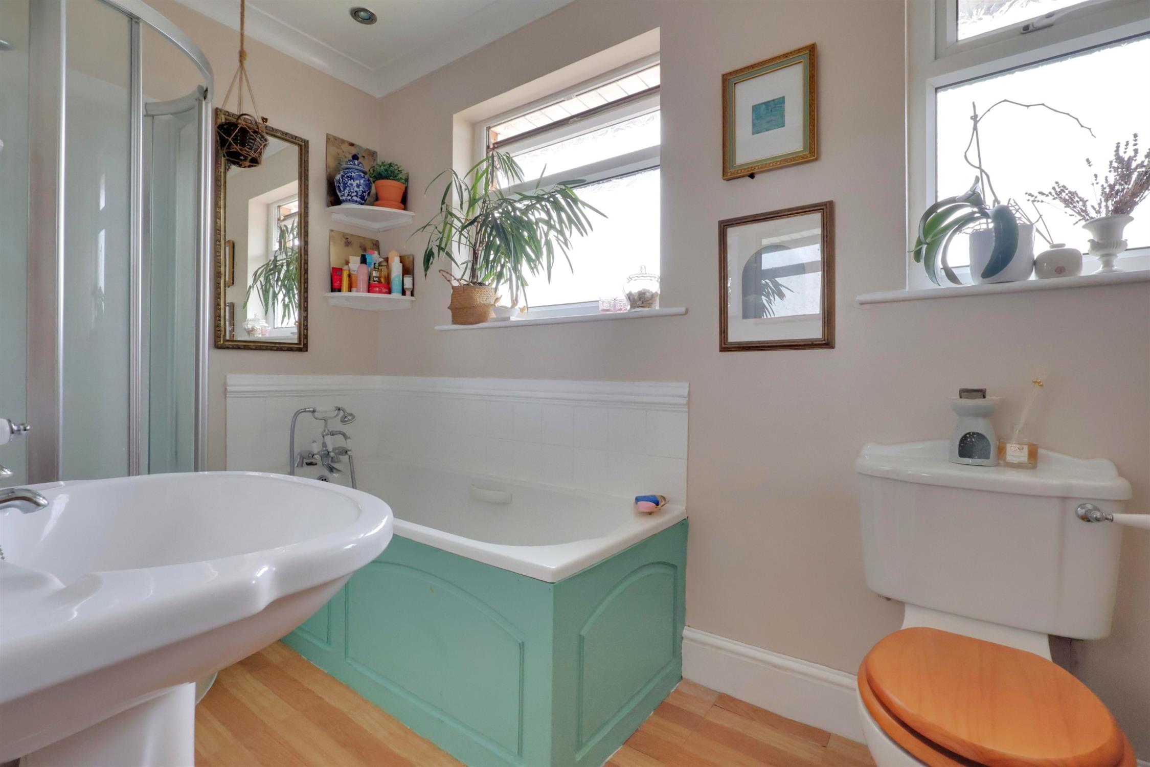 Two obscure double glazed windows to the rear elevation, four piece suite consisting of a panel bath with a shower off of the taps, low level wc, pedestal wash hand basin, corner shower cubicle, part tiled walls, smooth ceiling with inset spot lighting, laminate floor, obscure picture window giving light from the hall.