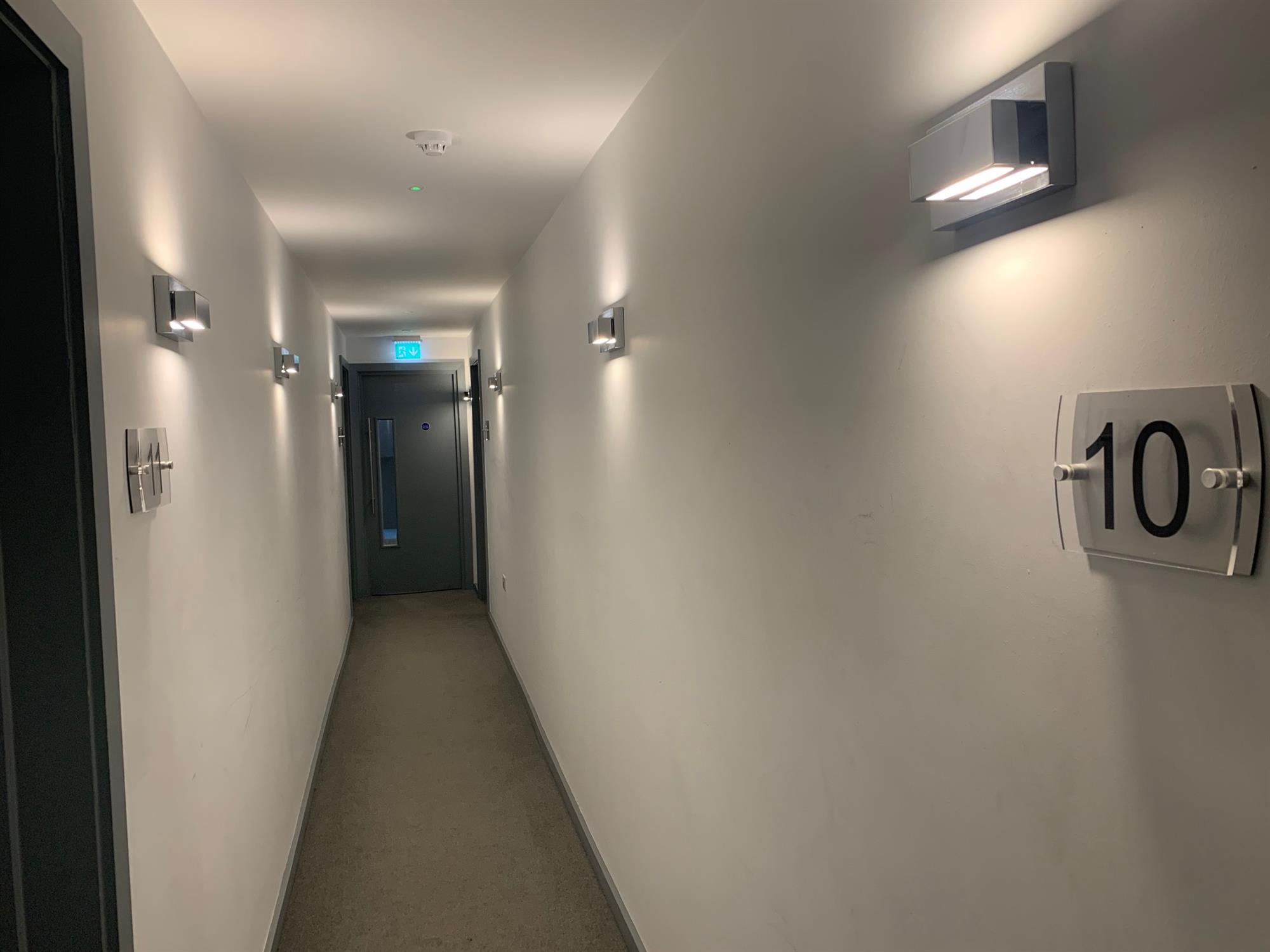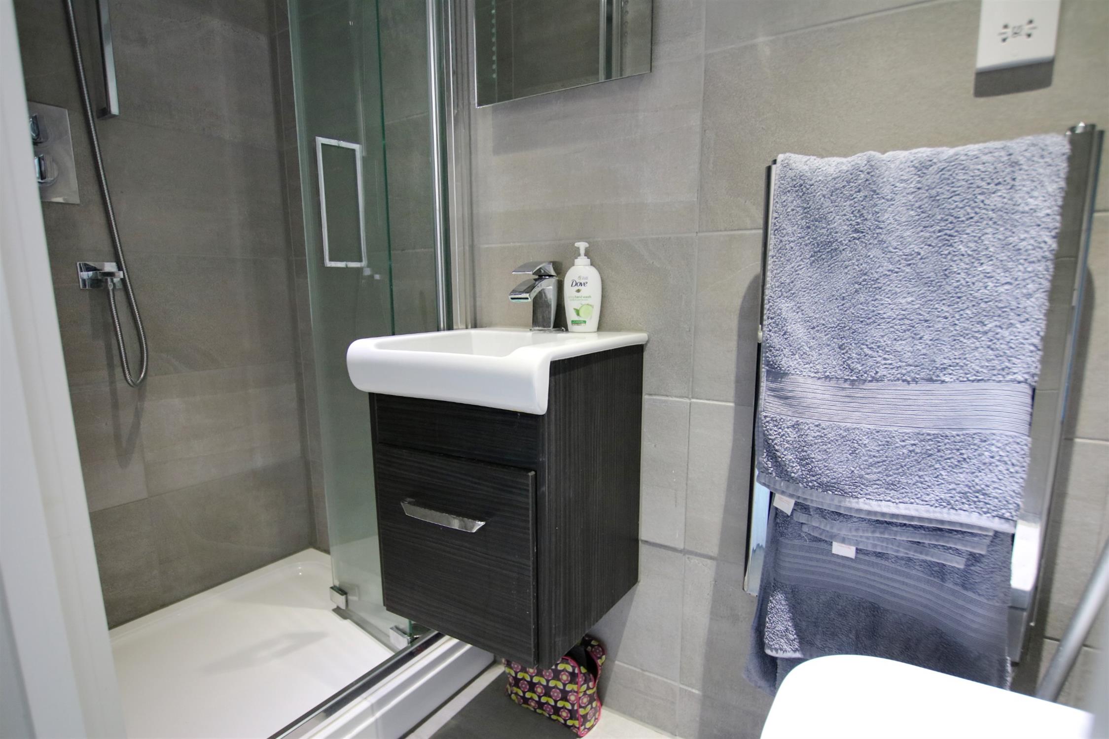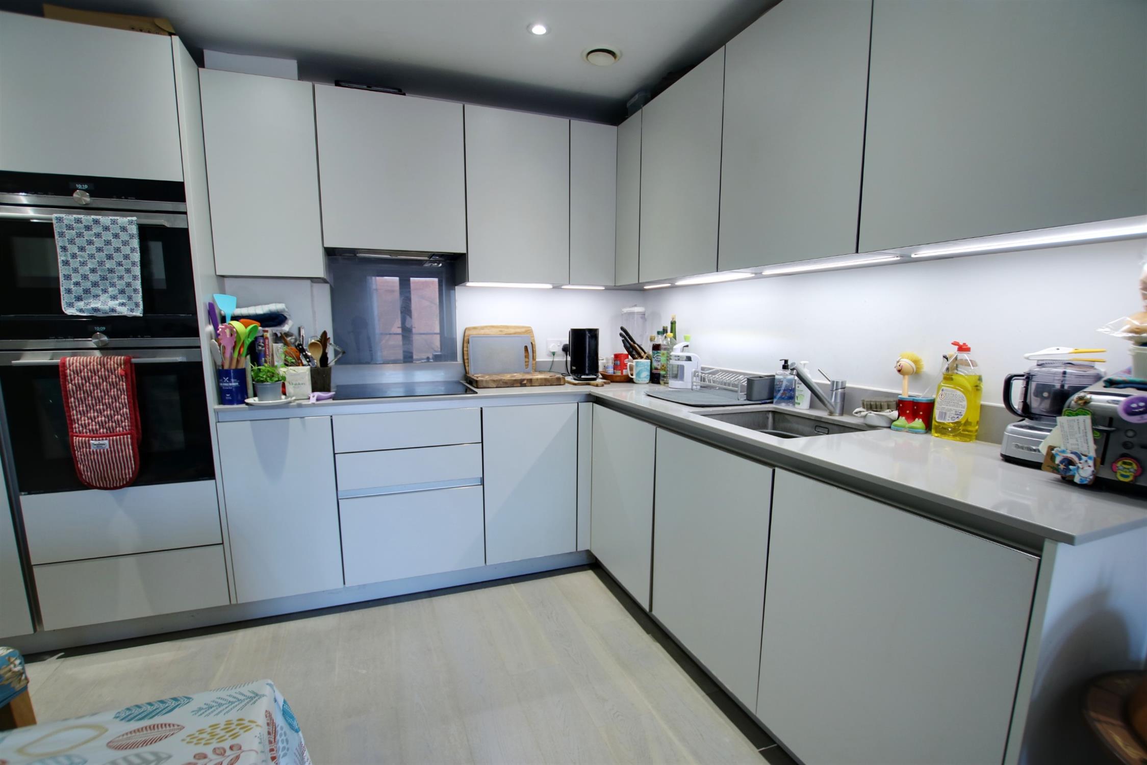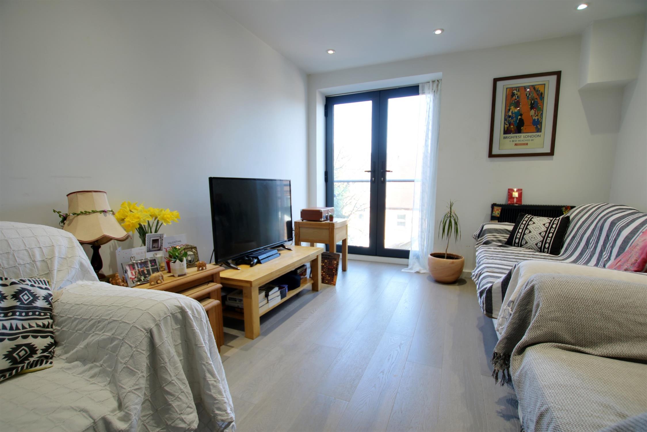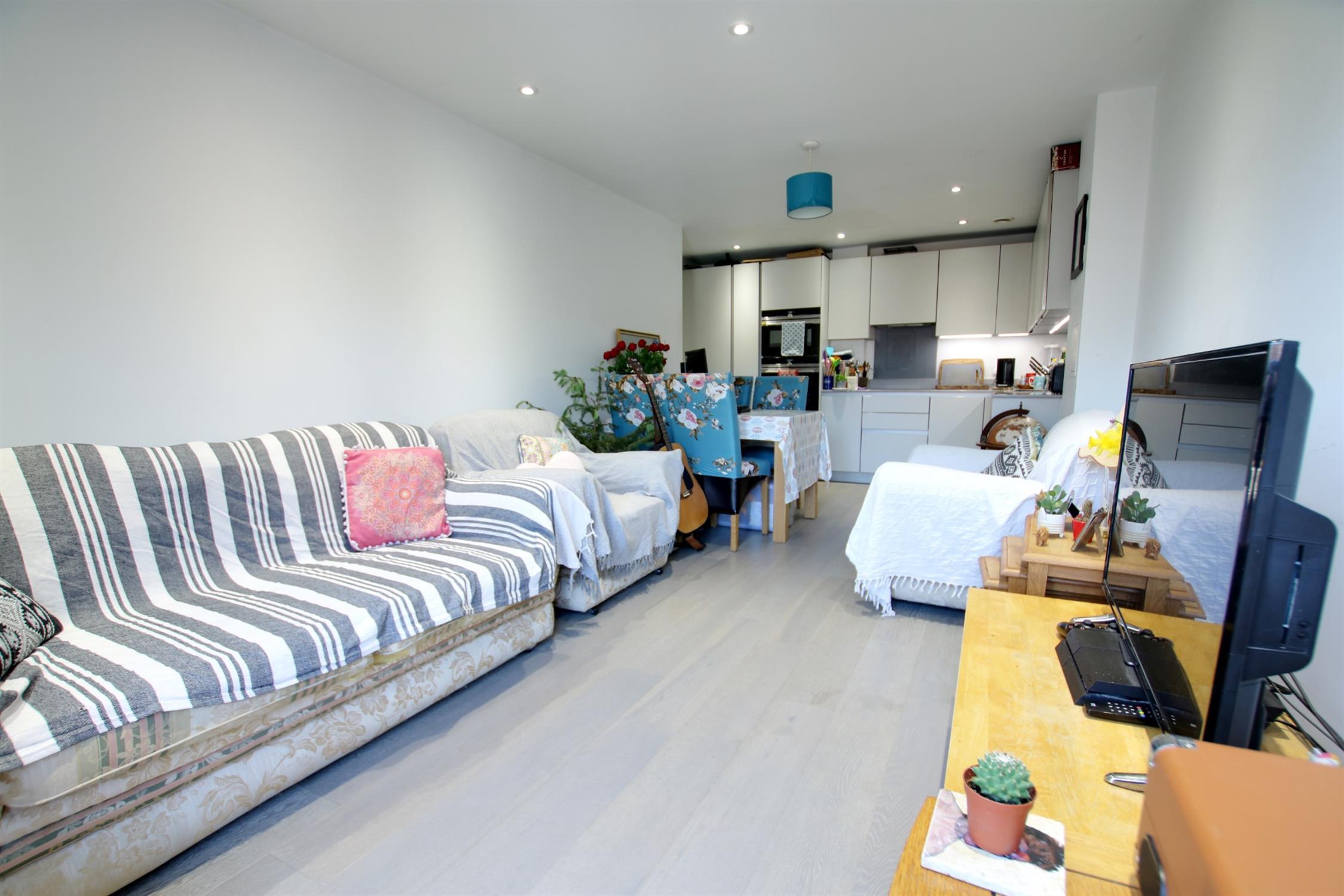 The entrance hall is fitted with an airing cupboard and the generous open plan living room offers space for both dining and lounge furniture and access to a Juliet balcony with Winchester. The kitchen has a sleek quartz worktop and is fitted with an integrated fridge/freezer, dishwasher, washer/dryer, double oven and hob. Both bedrooms are good sized doubles.