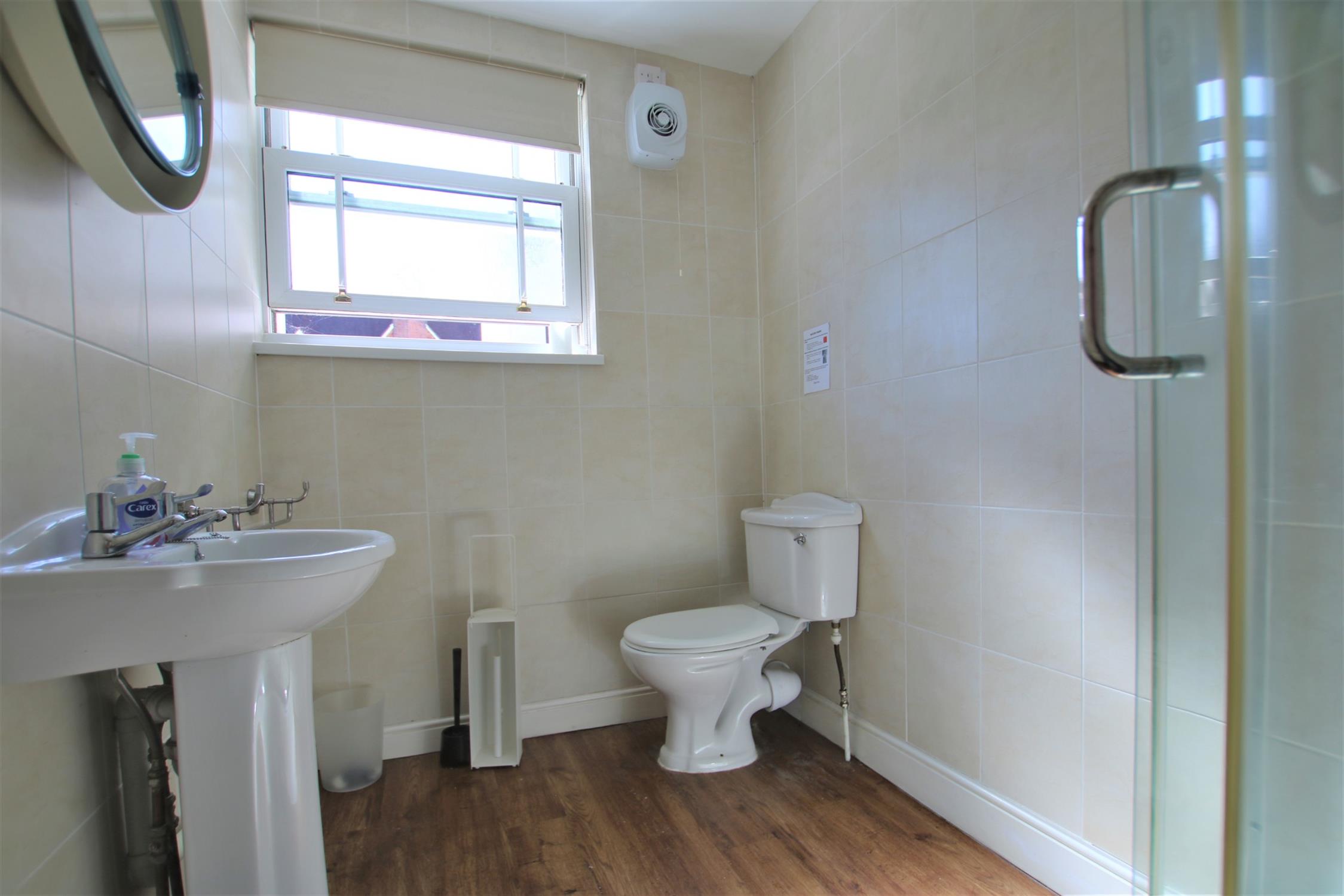 On the first floor there are two double bedrooms and a bathroom. Bedroom One is especially substantial, stretching across 18’ 9”. Bedroom Two offers built in storage. The bathroom is fitted with a corner shower, a white hand basin and a white WC.