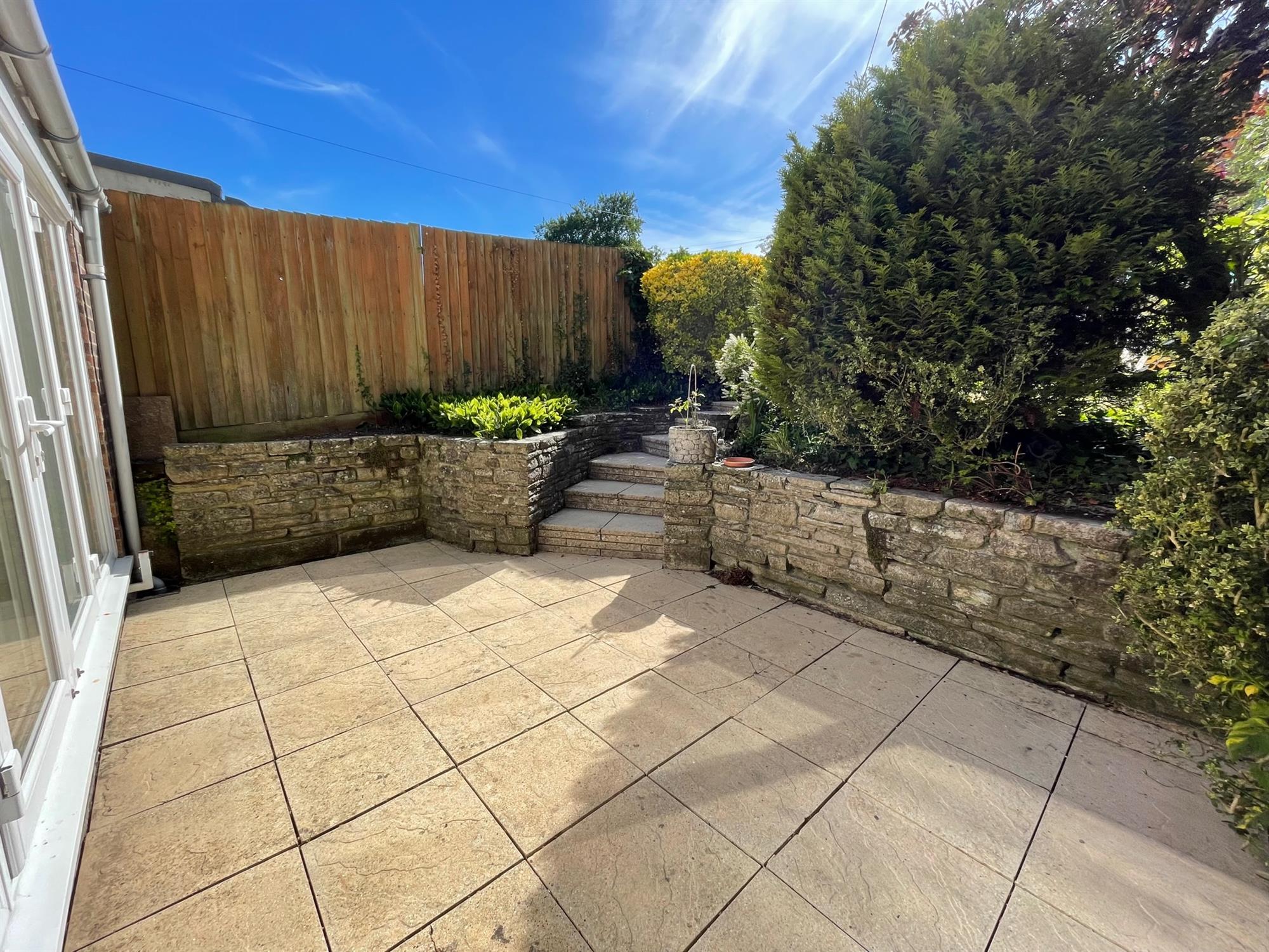 Outside there is an enclosed rear garden accessed from the sunroom. The lower section is a patio seating area and the steps lead up to a lawn bordered by mature shrubbery.