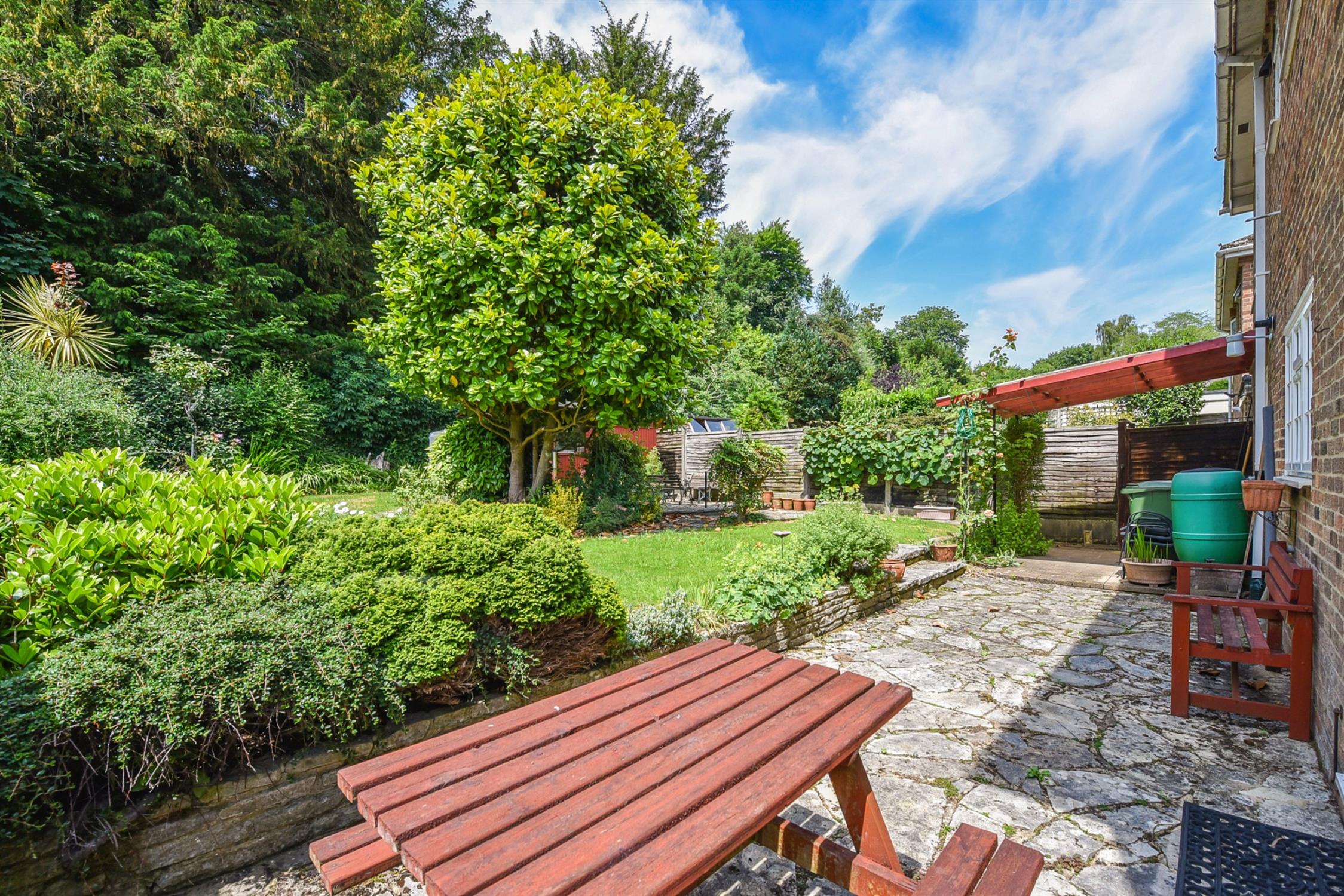 Adjacent to the utility room is a patio with pergola awning. A crazy paving patio is adjacent to the living room. The middle terrace is mainly laid to lawn with crazy paving and leads up to the raised lawn. Maturely planted beds border the garden and there is a workshop with power and light.