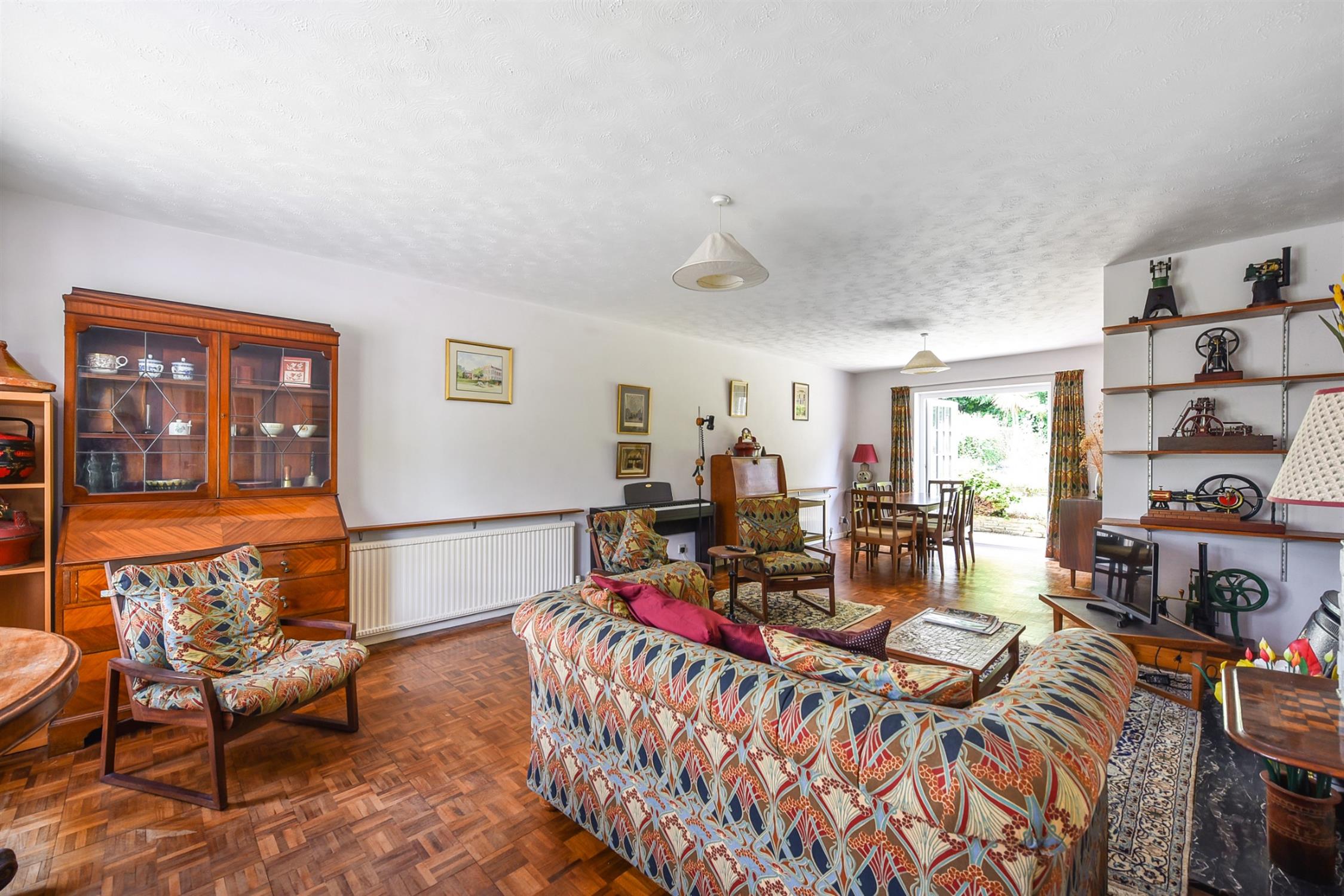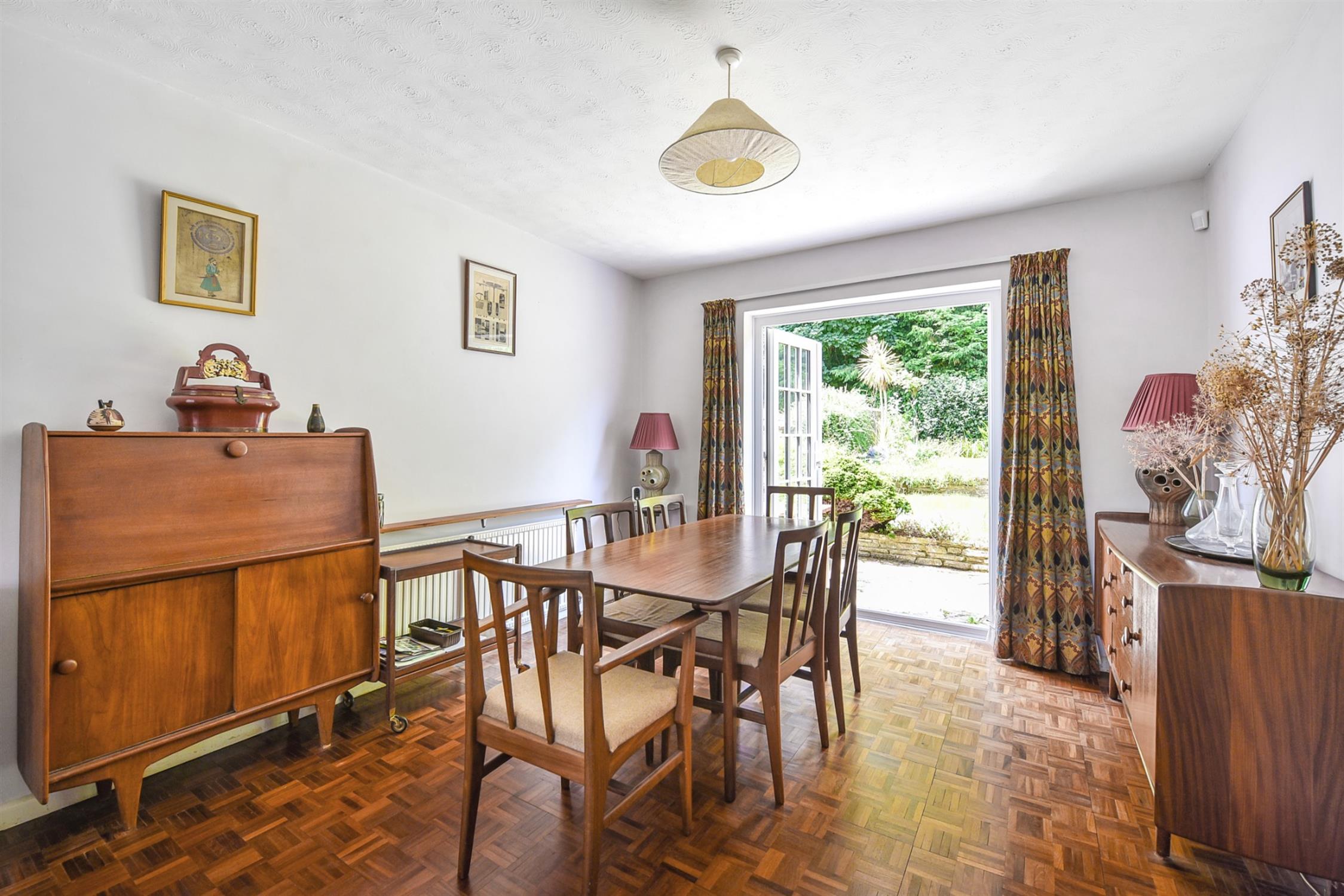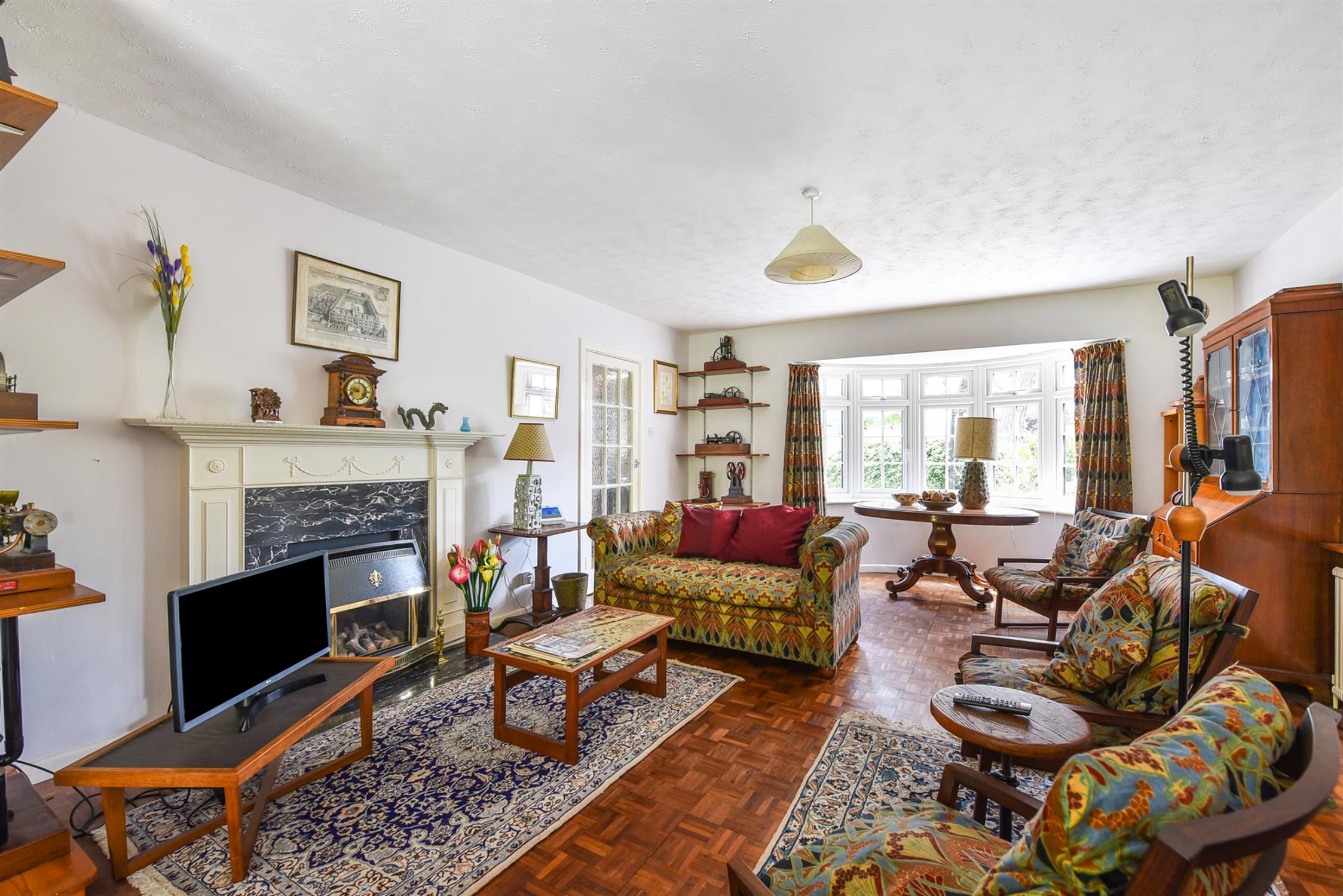 A particularly spacious living room with room for both living and dining room furniture, gas fire with mantle and surround, curved bay window and double doors to the rear garden.