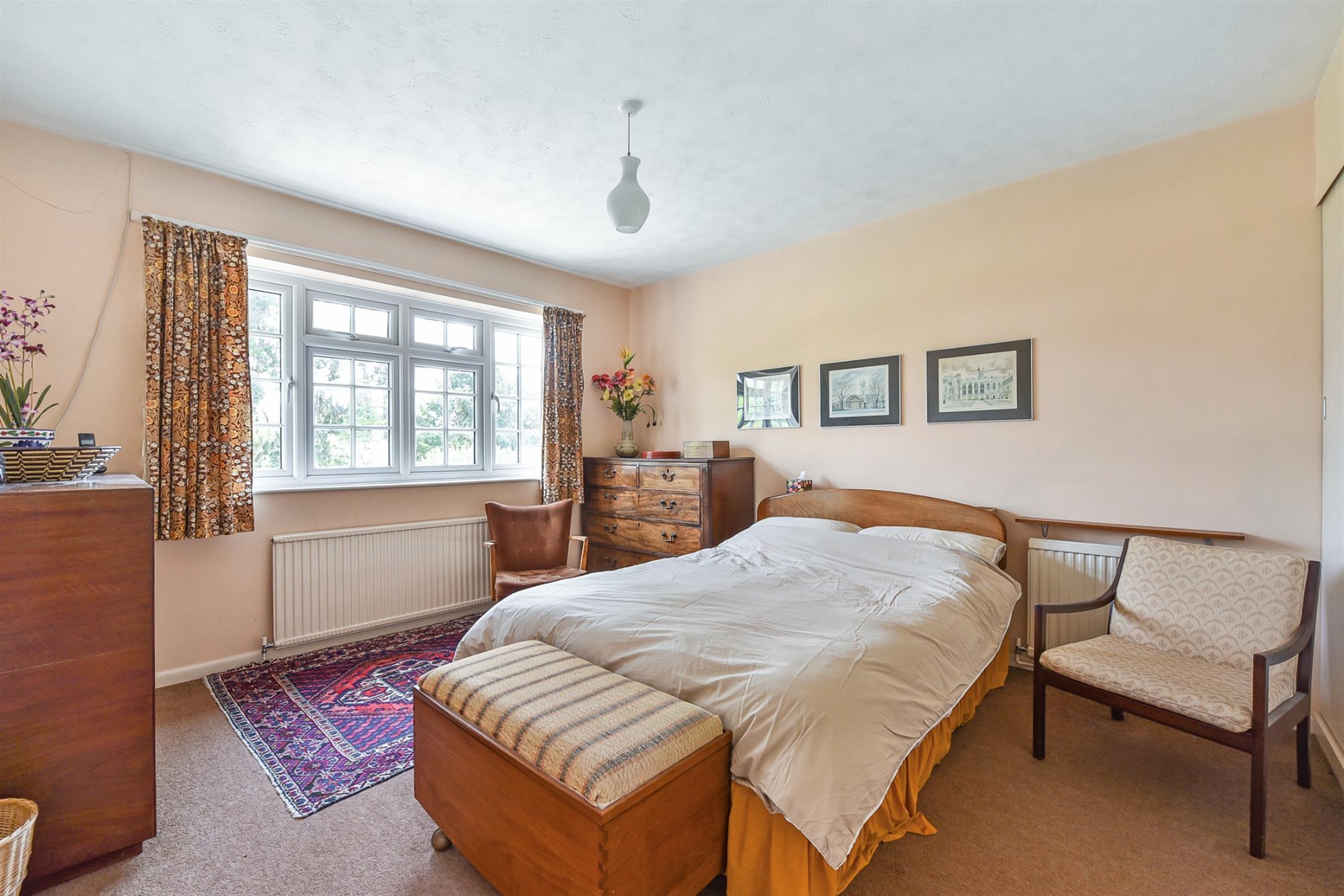 A generous double. Built-in wardrobes with sliding doors, lovely view of the front garden.