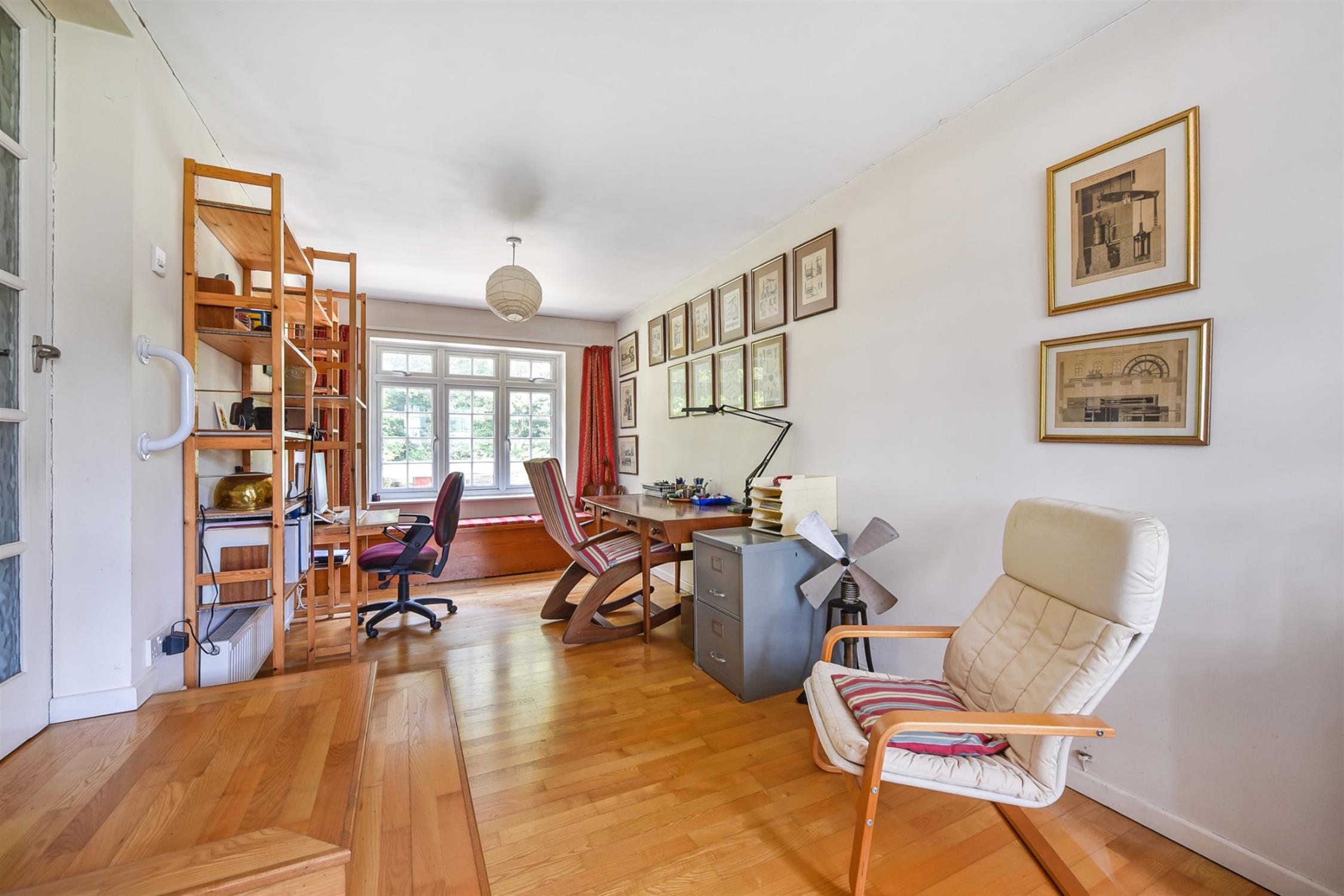 Built onto the side as an extension above the garage, this versatile room is spacious and currently serves as a study and gallery.