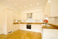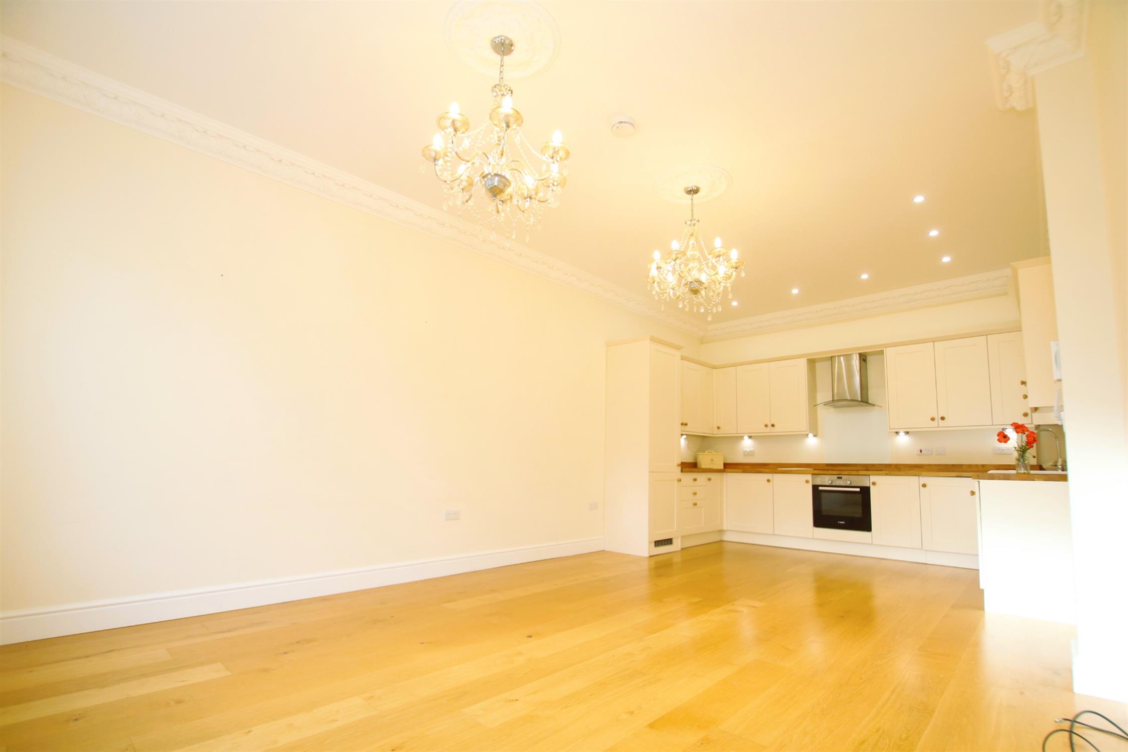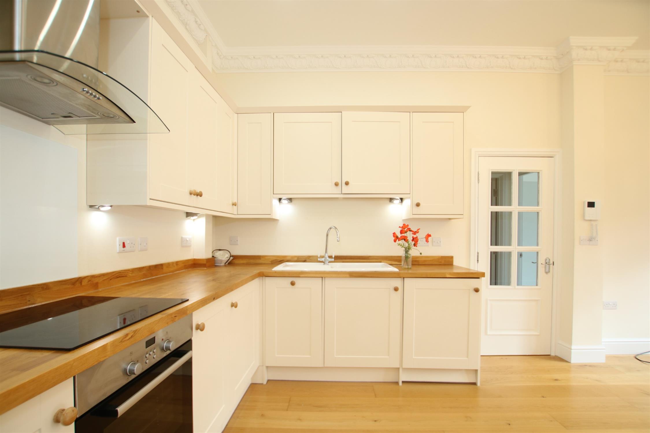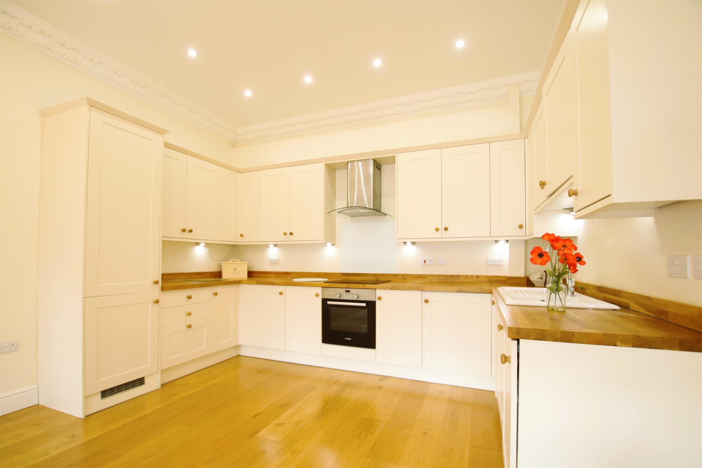 Upon entry, you are greeted with an open-plan kitchen and a living room with a fully fitted kitchen, which consists of solid oak worktops and is topped with accent lighting and a chandelier.