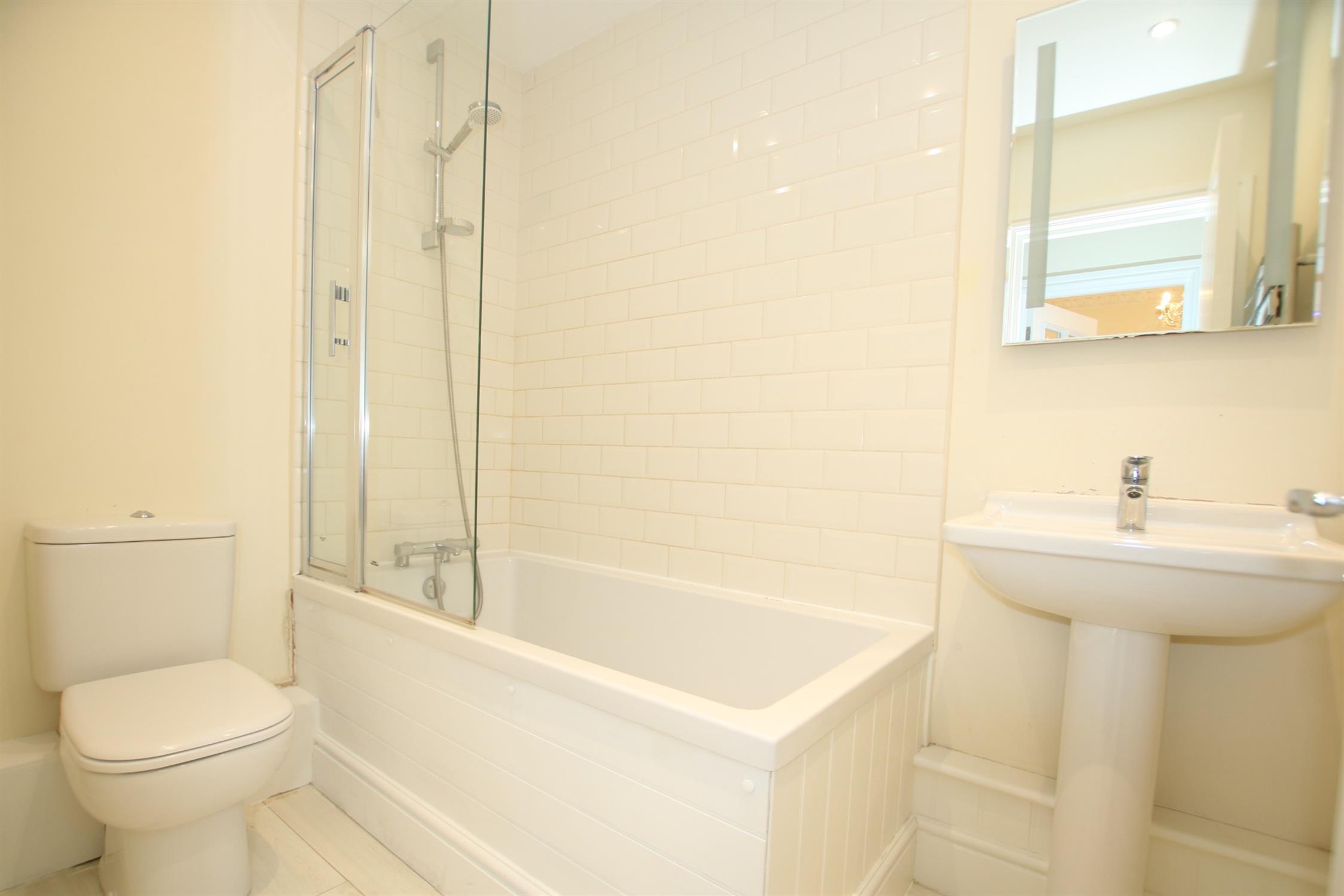 The bathroom is made up with a shower over the bath, equipped with a lit mirror, basin, and heated towel rail.