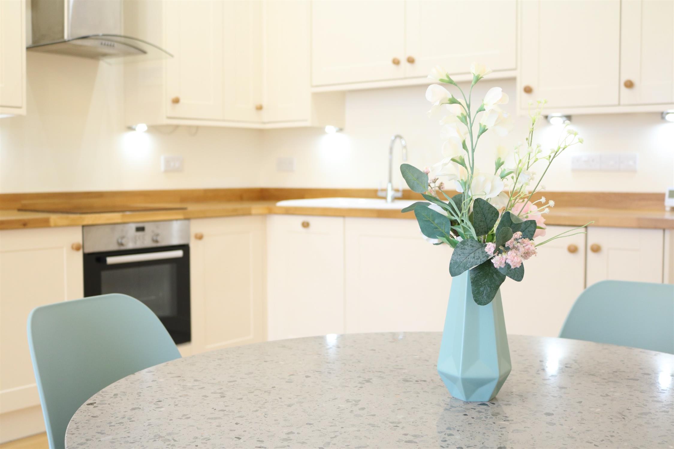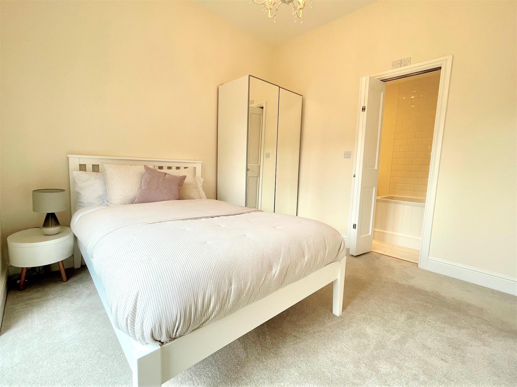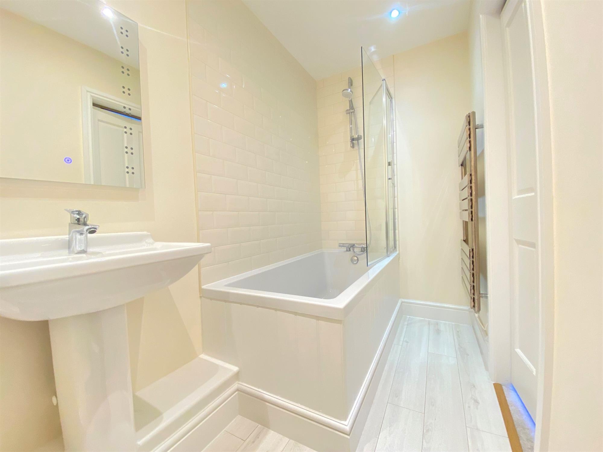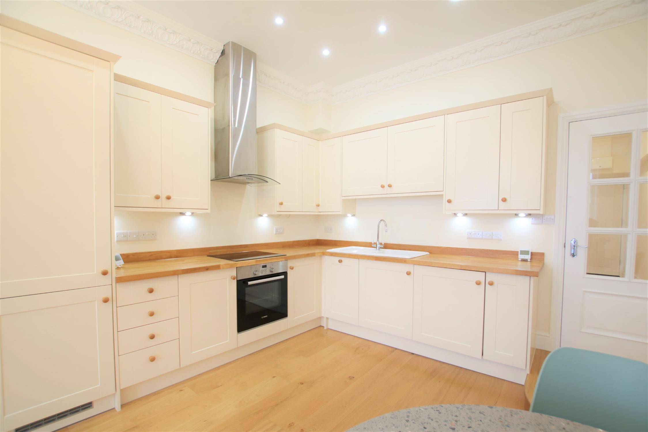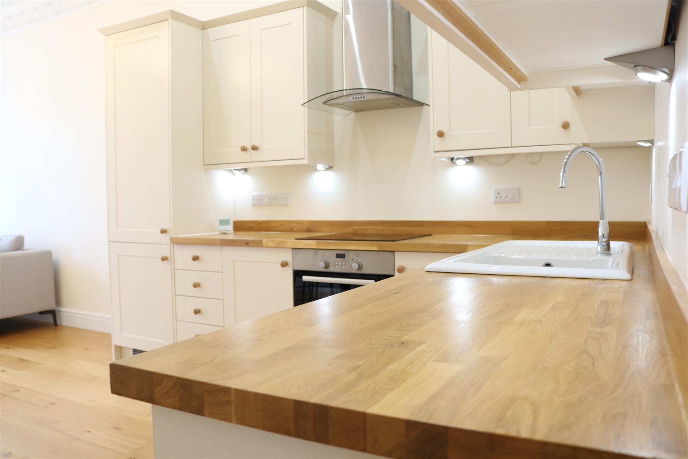 Upon entry, there is a hallway that leads through to the accommodation. The open-plan kitchen/living room is a terrific size, spanning across 24ft in length with Kahrs wooden flooring. Two original sash windows allow an abundance of natural light into the space and cornicing adds a classic element. The kitchen is fitted with a range of eye and low-level shaker style units with solid wood worktop and handles. It has been fitted with integrated Bosch appliances including fridge/freezer, washing machine, dishwasher and Belfast sink.
