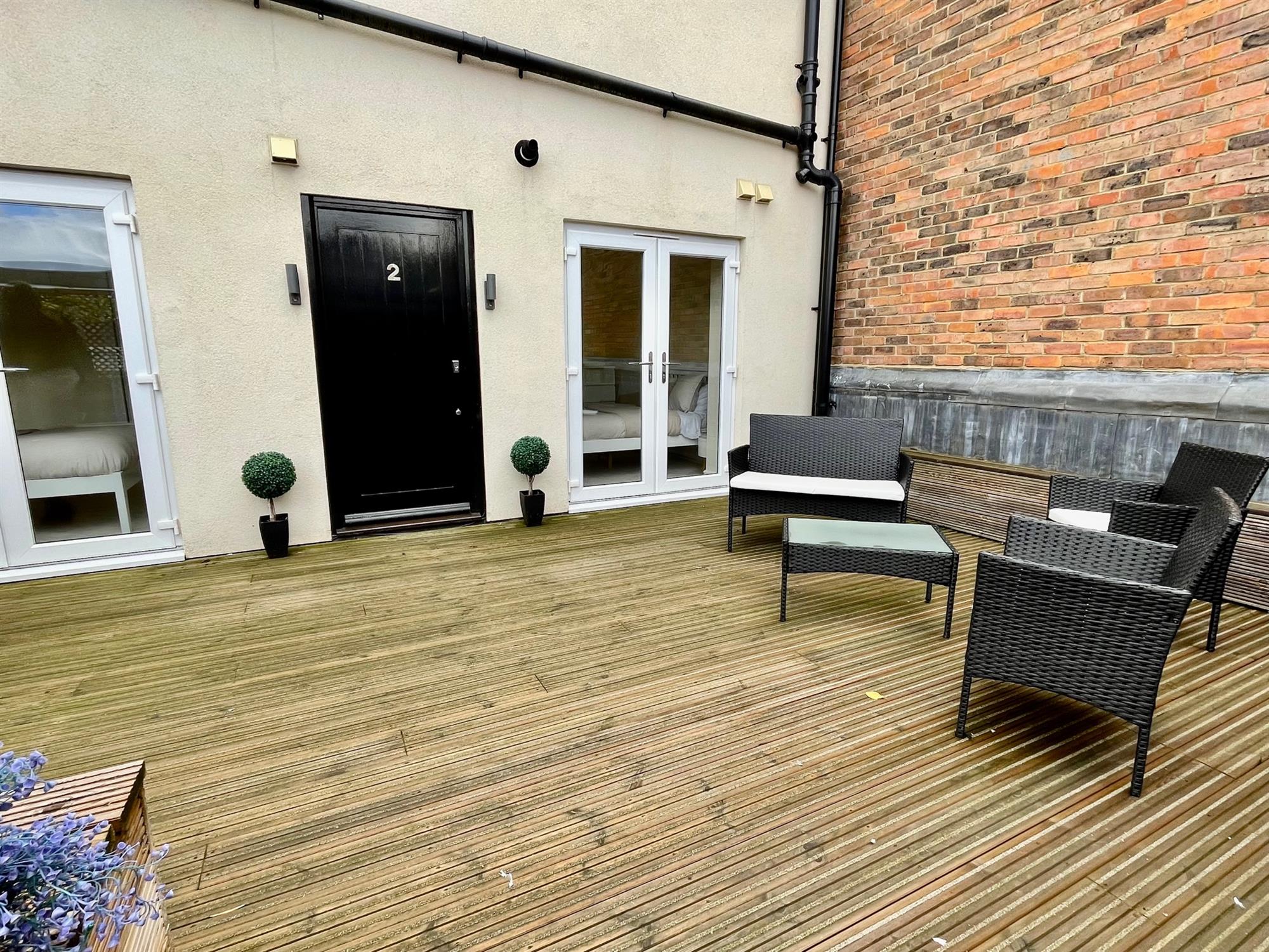 The main entrance has a secure phone entry system and a staircase leads to the first floor where the apartment can be accessed via a private entrance from the decked seating area.