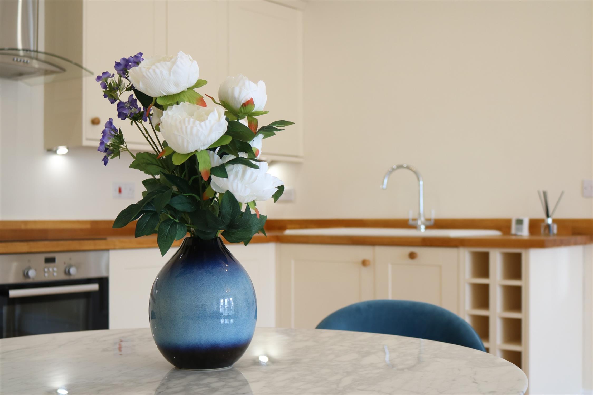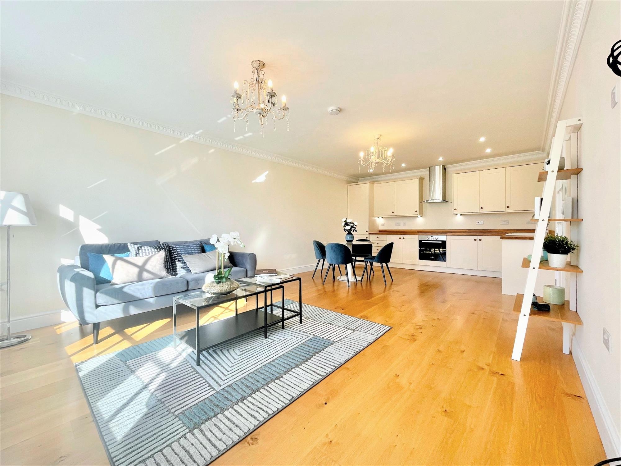 Upon entry, there is a spacious central hall that leads through to the accommodation. The open-plan kitchen/living room is a terrific size, spanning across 23ft in length with Kahrs wooden flooring. Three large original sash windows allow an abundance of natural light into the space and cornicing adds a classic element. The kitchen is fitted with a range of eye and low-level shaker style units with solid wood worktop and handles. It has been fitted with integrated Bosch appliances including fridge/freezer, washing machine, dishwasher and Belfast sink.