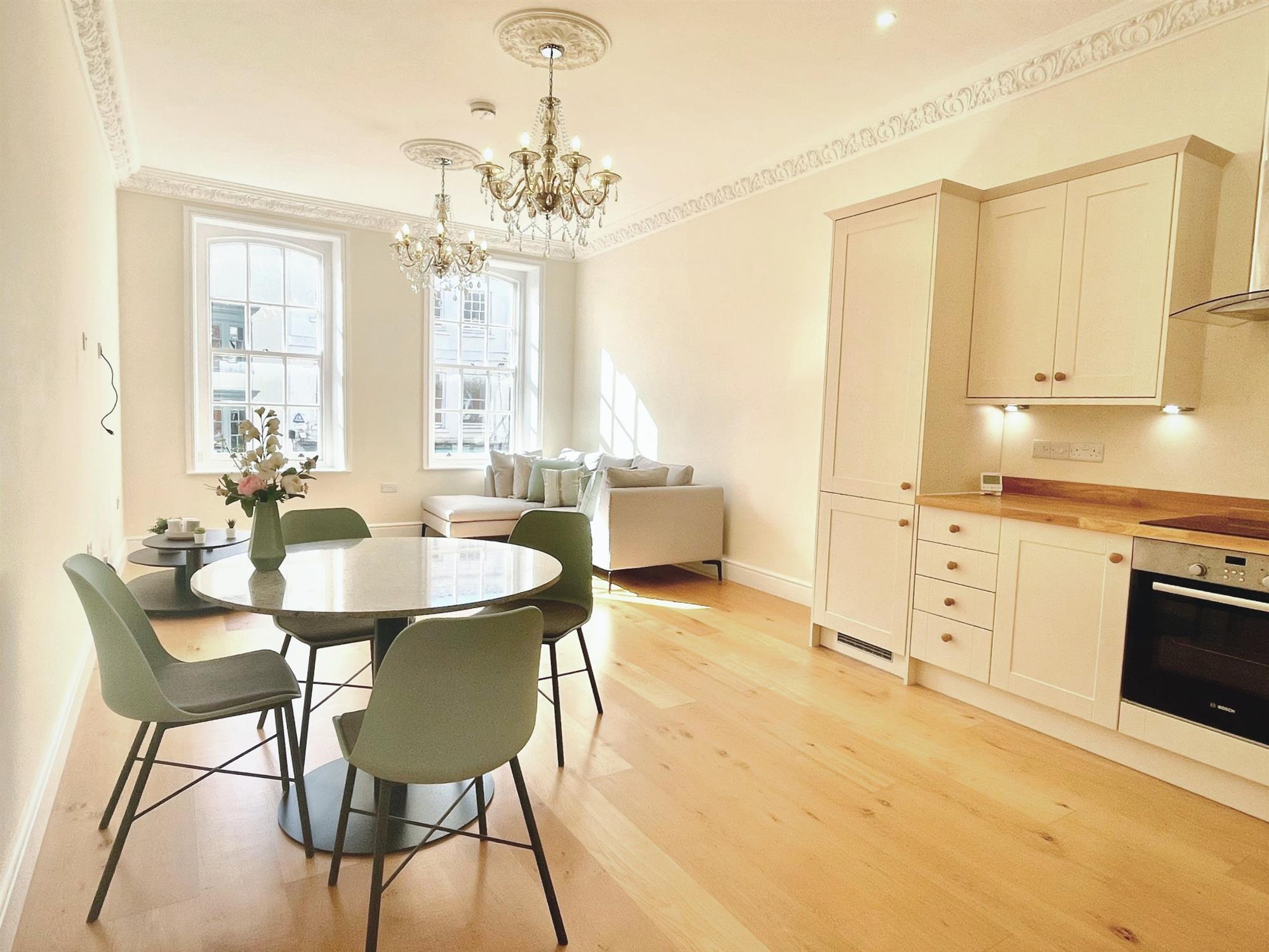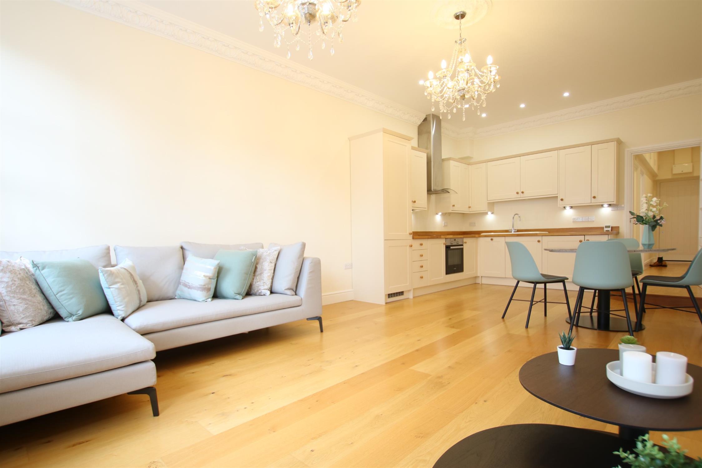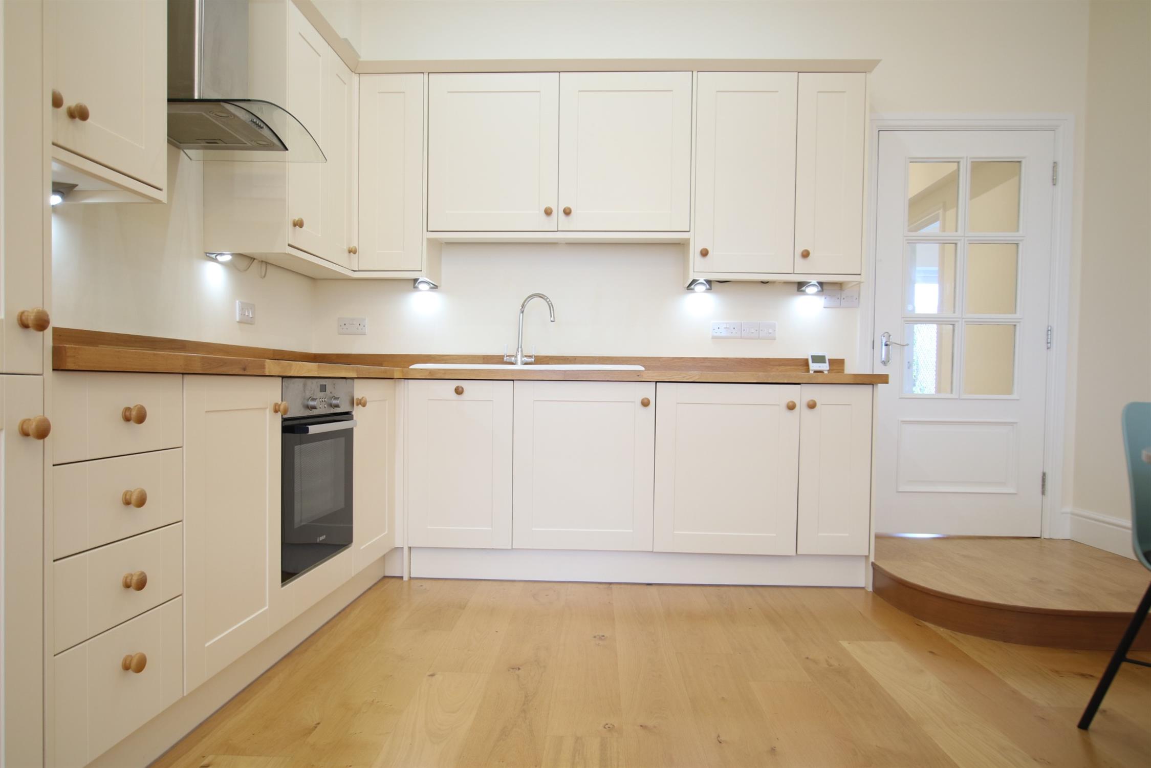 Upon entry, there is a hallway that leads through to the accommodation. The open-plan kitchen/living room is a terrific size, spanning across 24ft in length with Kahrs wooden flooring. Two original sash windows allow an abundance of natural light into the space and cornicing adds a classic element. The kitchen is fitted with a range of eye and low-level shaker style units with solid wood worktop and handles. It has been fitted with integrated Bosch appliances including fridge/freezer, washing machine, dishwasher and Belfast sink.