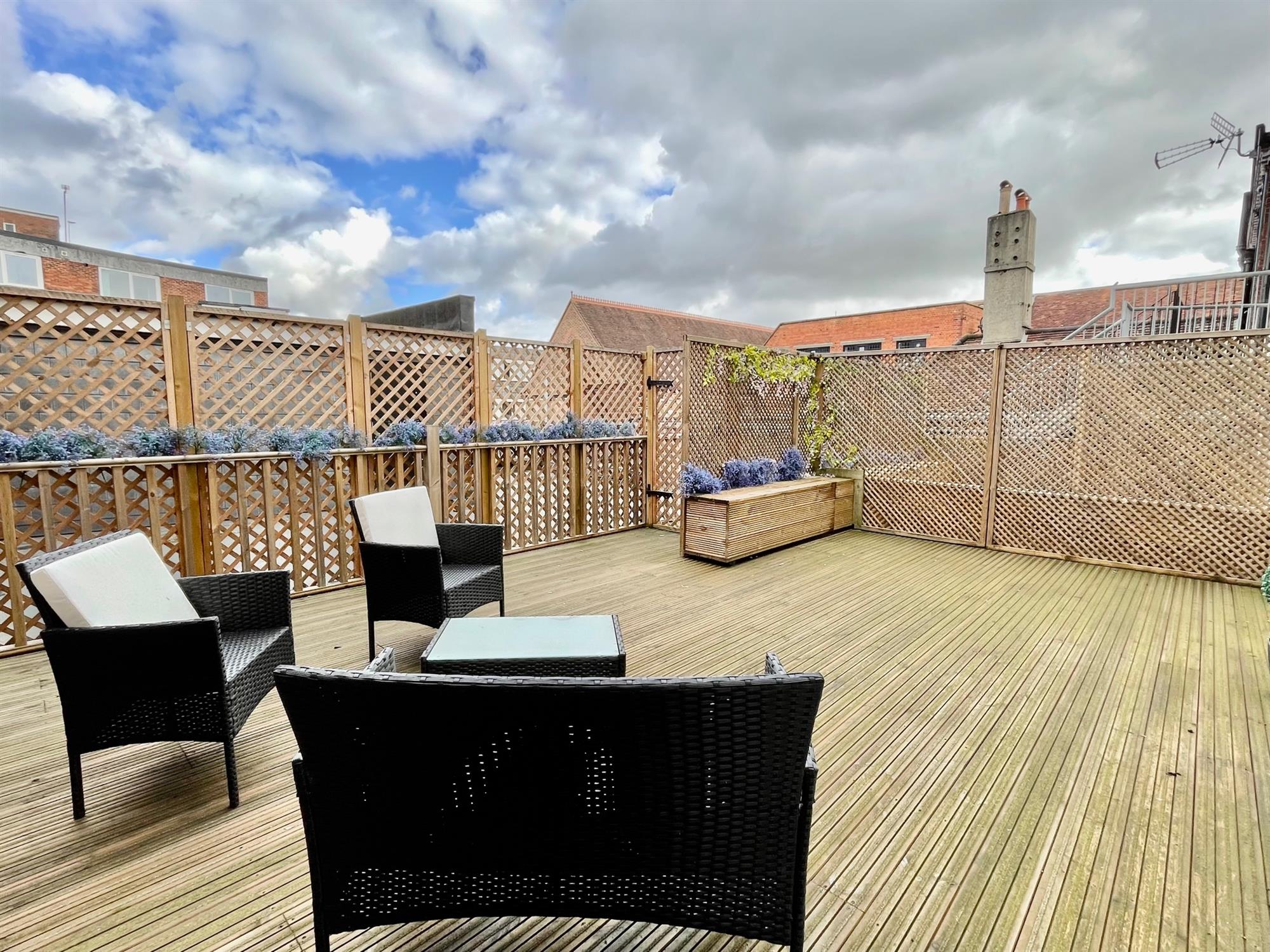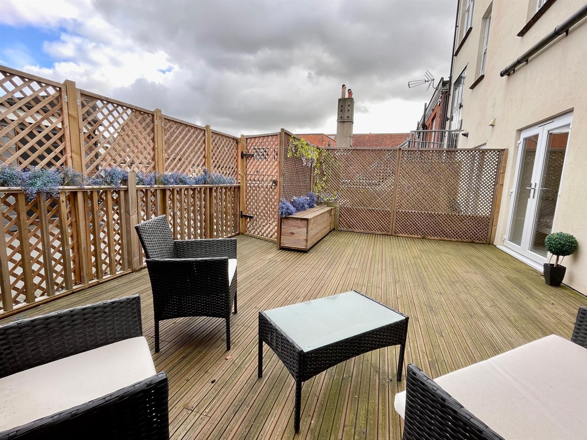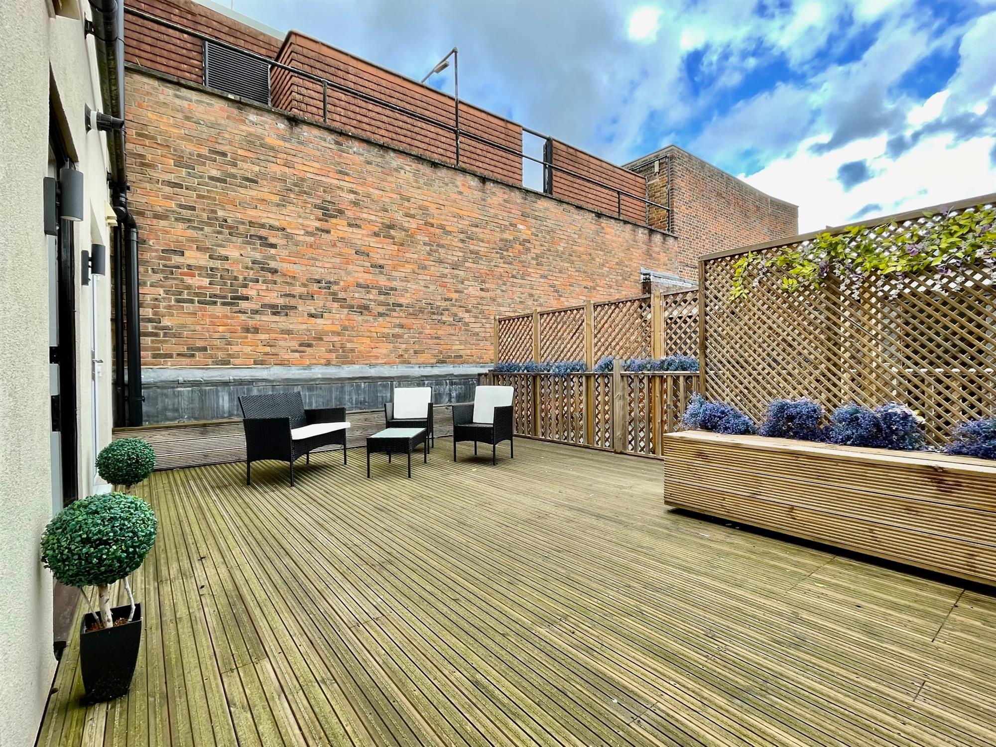 The main entrance has a secure phone entry system and a staircase leads to the first floor where the apartment can be accessed via a private entrance from the decked seating area.