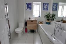 Matching suite comprising of panelled bath with mixer taps and shower attachment, pedestal wash basin. Low level WC. Obscured double glazed window. Fully tiled. Feature mirror. Chrome ladder style radiator.