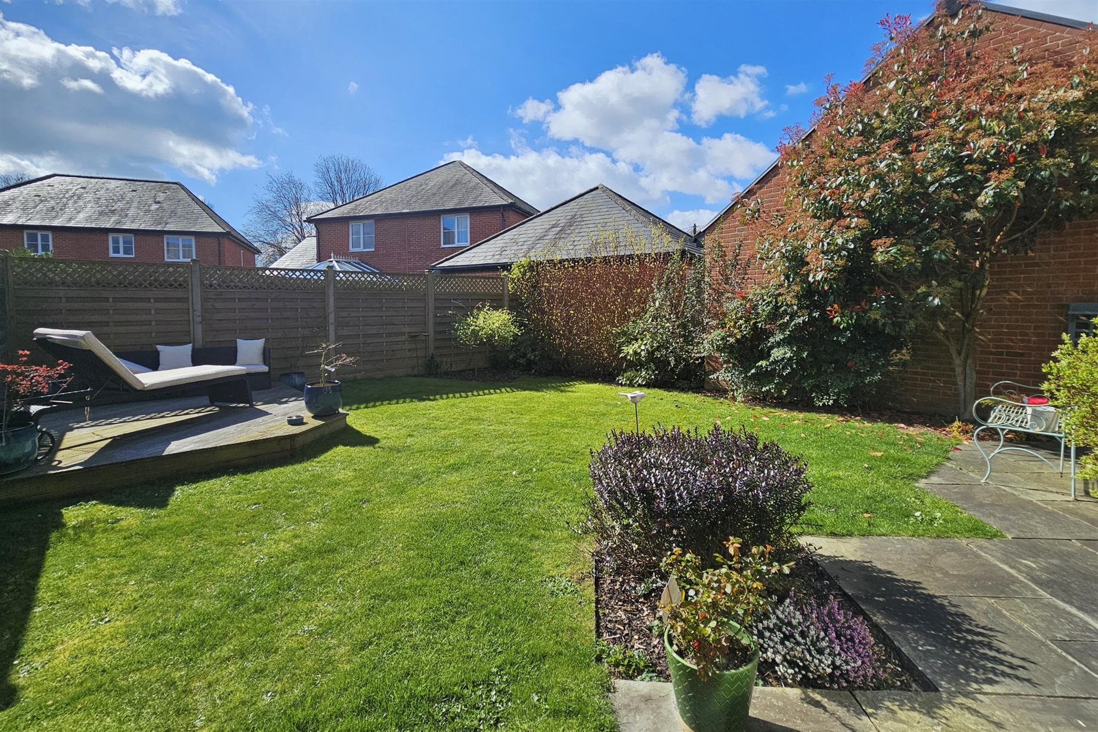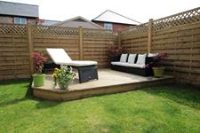 Fully enclosed with patio area. Raised timber decked seating area. Patio lantern. Outside tap. Flower and shrub borders.
