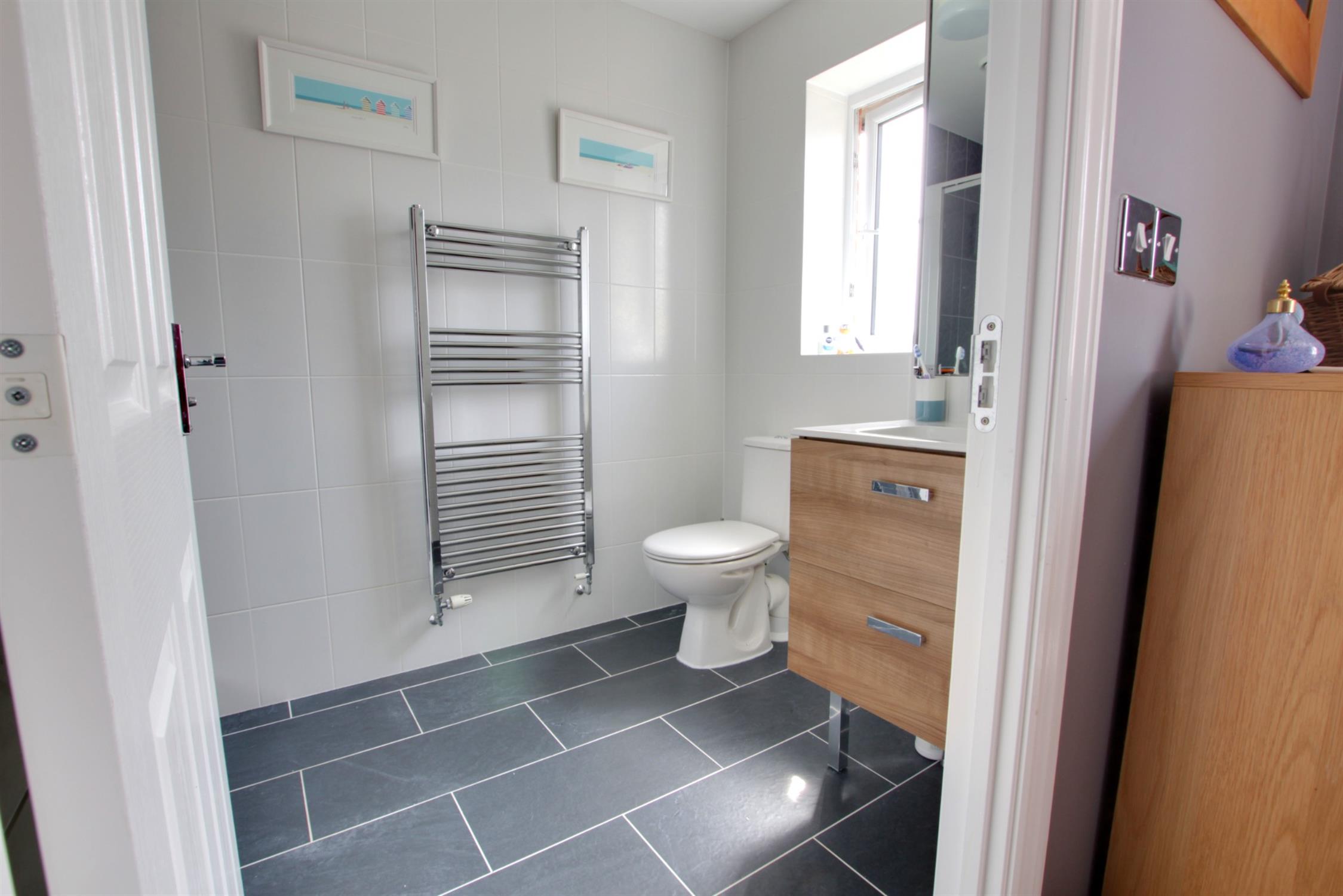 Step in shower cubicle. Low level WC. Wash basin. Fully tiled with chrome ladder style radiator.