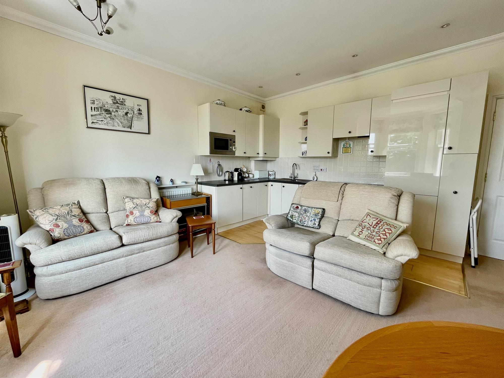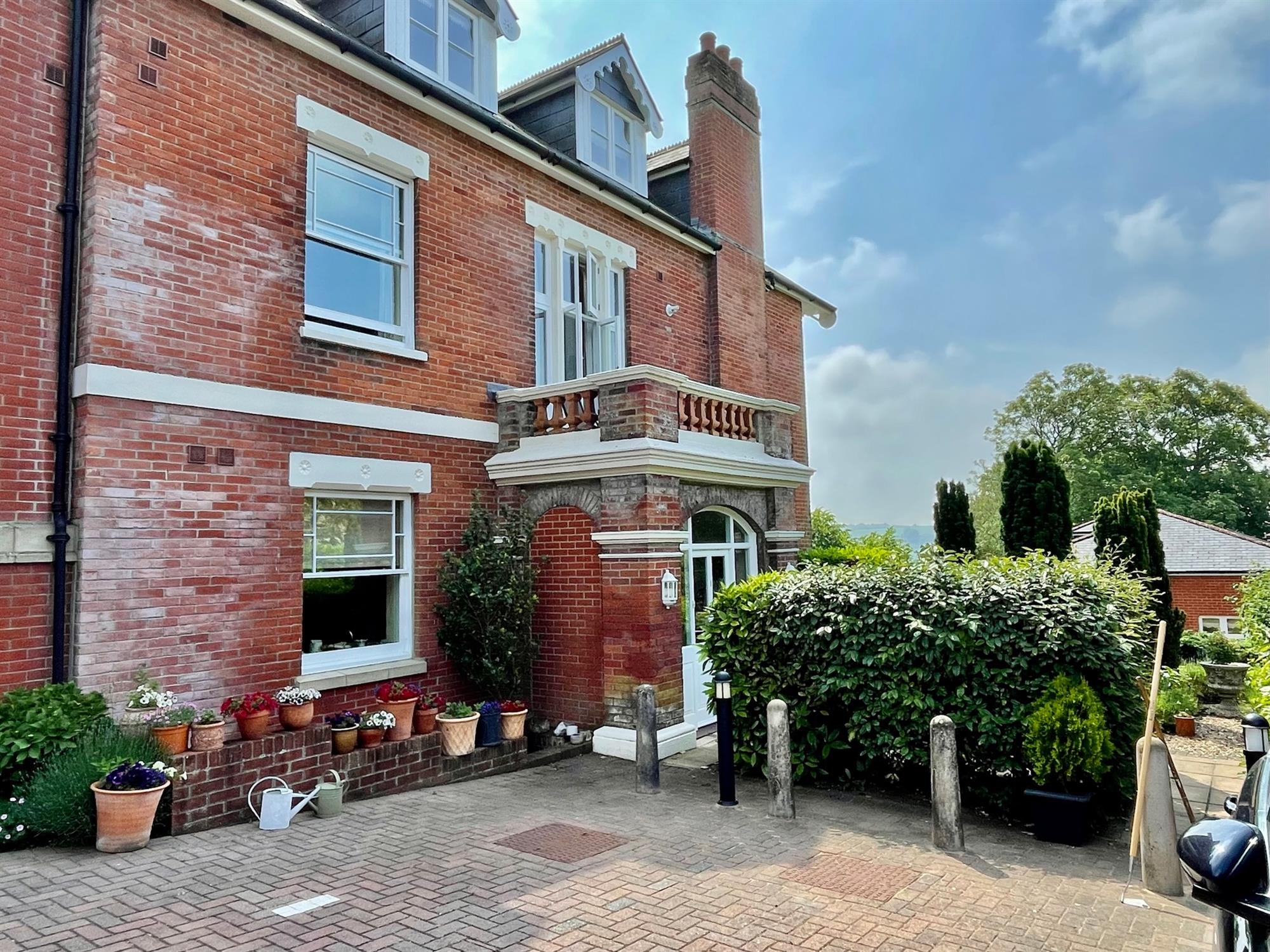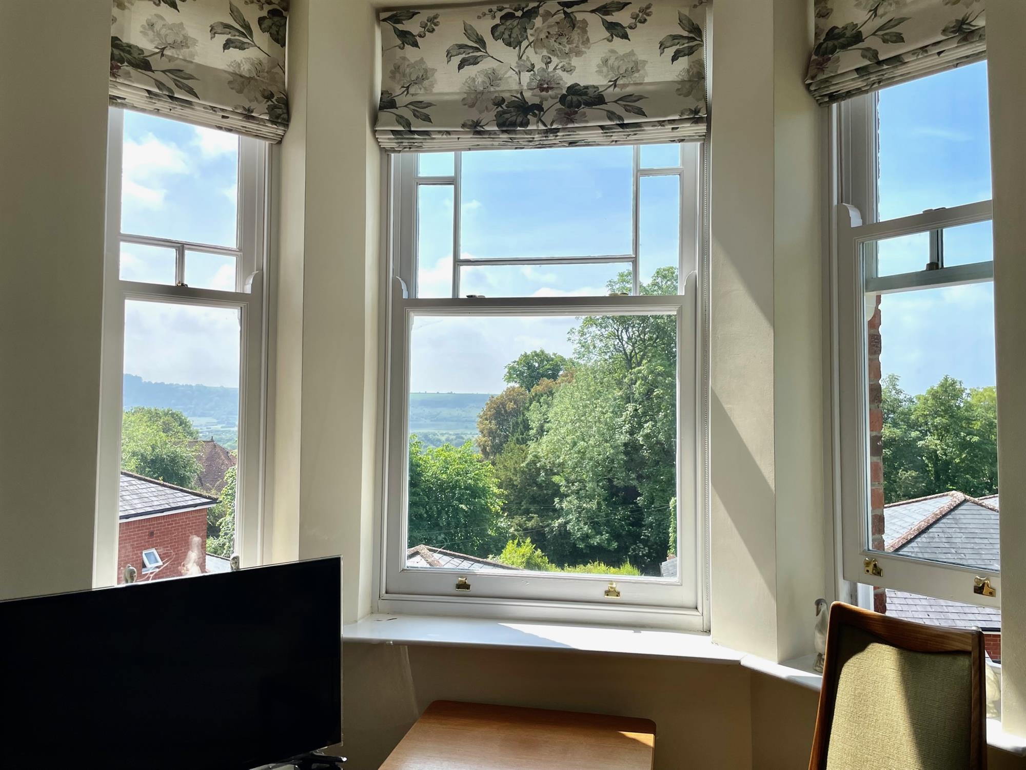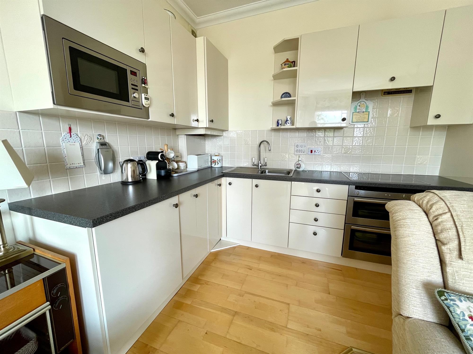 The building is accessed via a secure telecom entry system, and stairs and a lift provide access to the apartment. Upon entry, there is a spacious entrance hall with a built-in storage cupboard. The kitchen/living room is open-plan and a terrific size with ample room for both lounge and dining furniture. A large bay window allows plenty of natural light into the space and offers beautiful far-reaching views of the countryside. The kitchen is L-shape and fitted with a range of gloss white eye and low-level units with integrated appliances including double oven, electric hob, microwave and fridge/freezer. The property offers two bedrooms, both of which are doubles and offer built-in storage. Bedroom two further benefits from a characterful balcony with leafy views and plenty of space to sit. The bathroom is a white suite and is fitted with a double length shower, toilet, handbasin and heated towel rail.