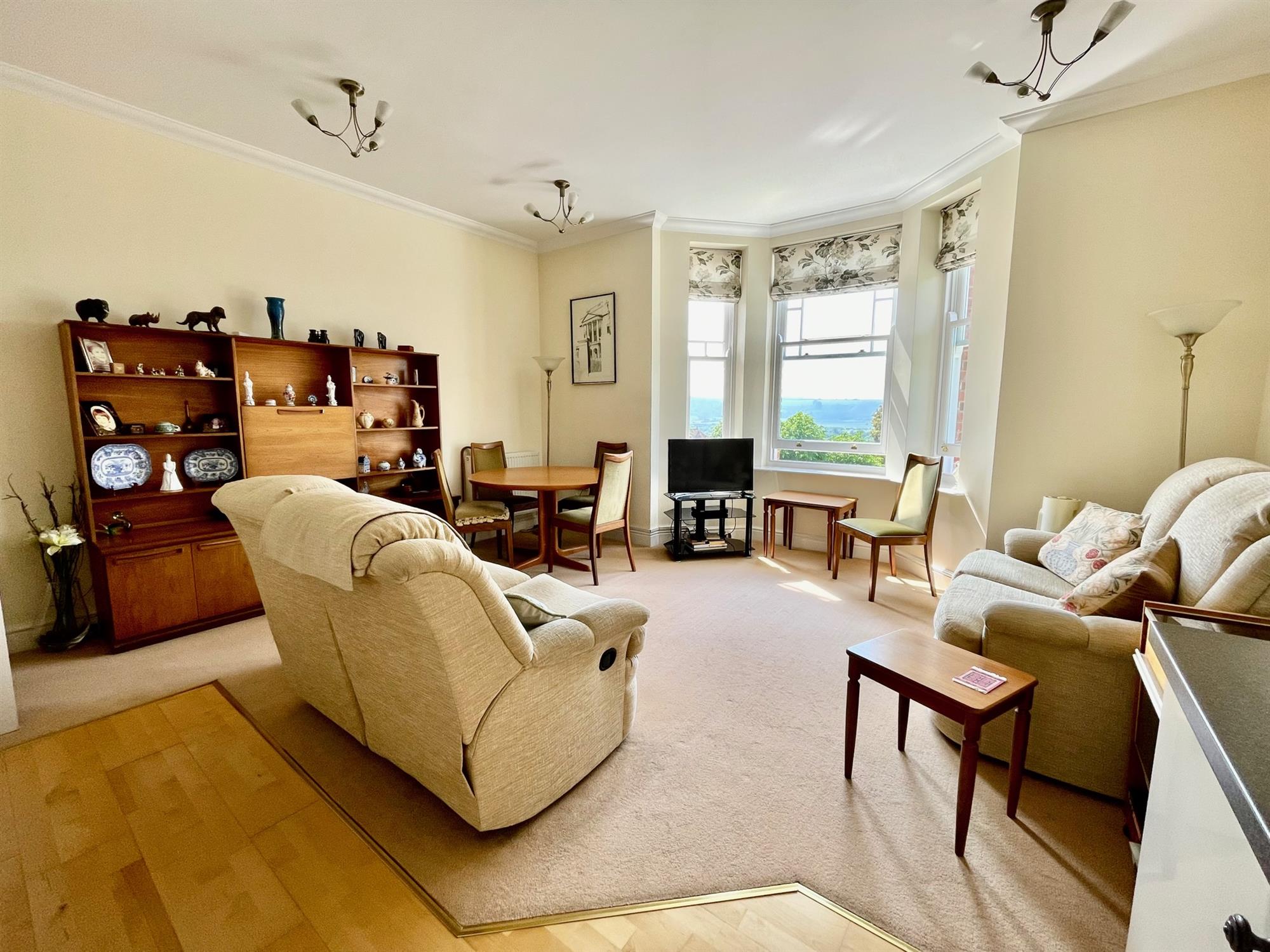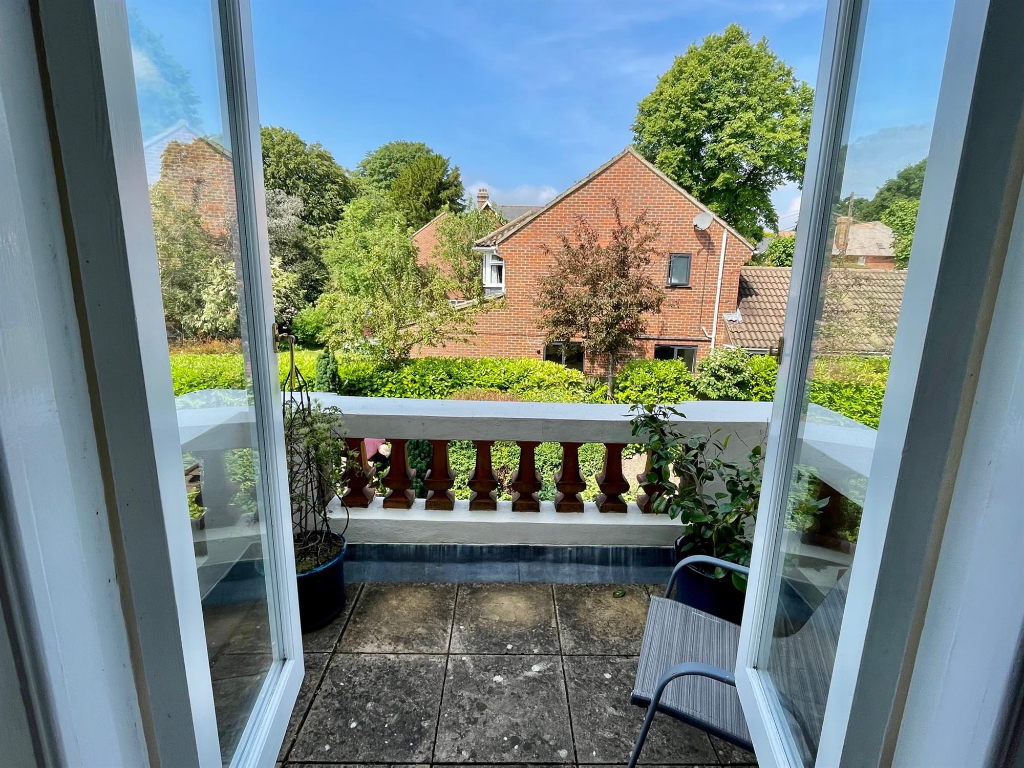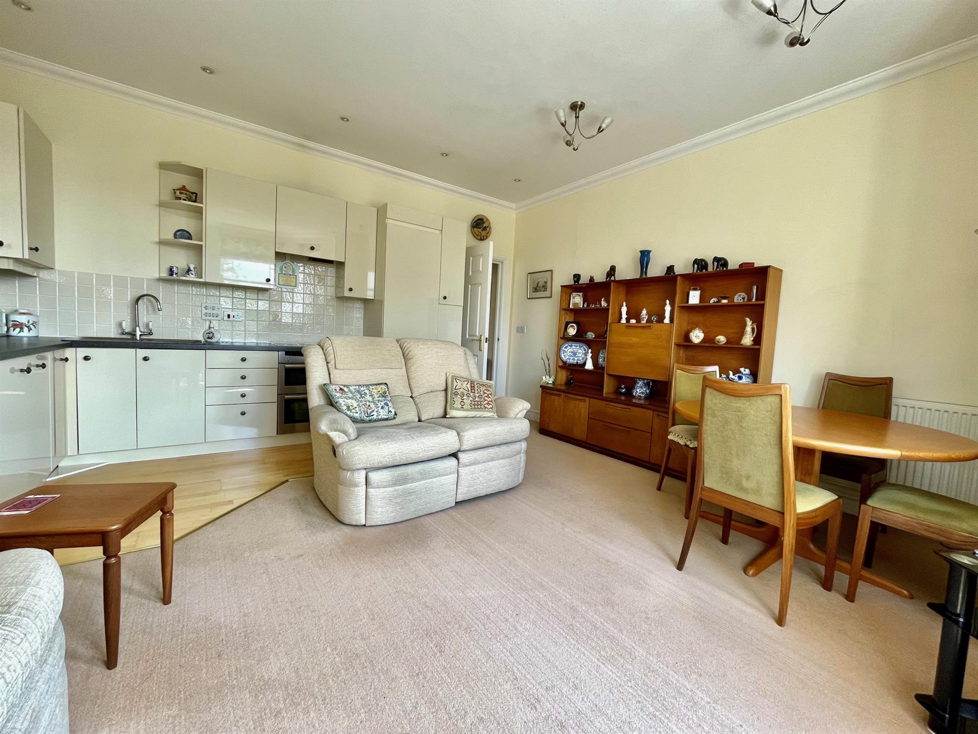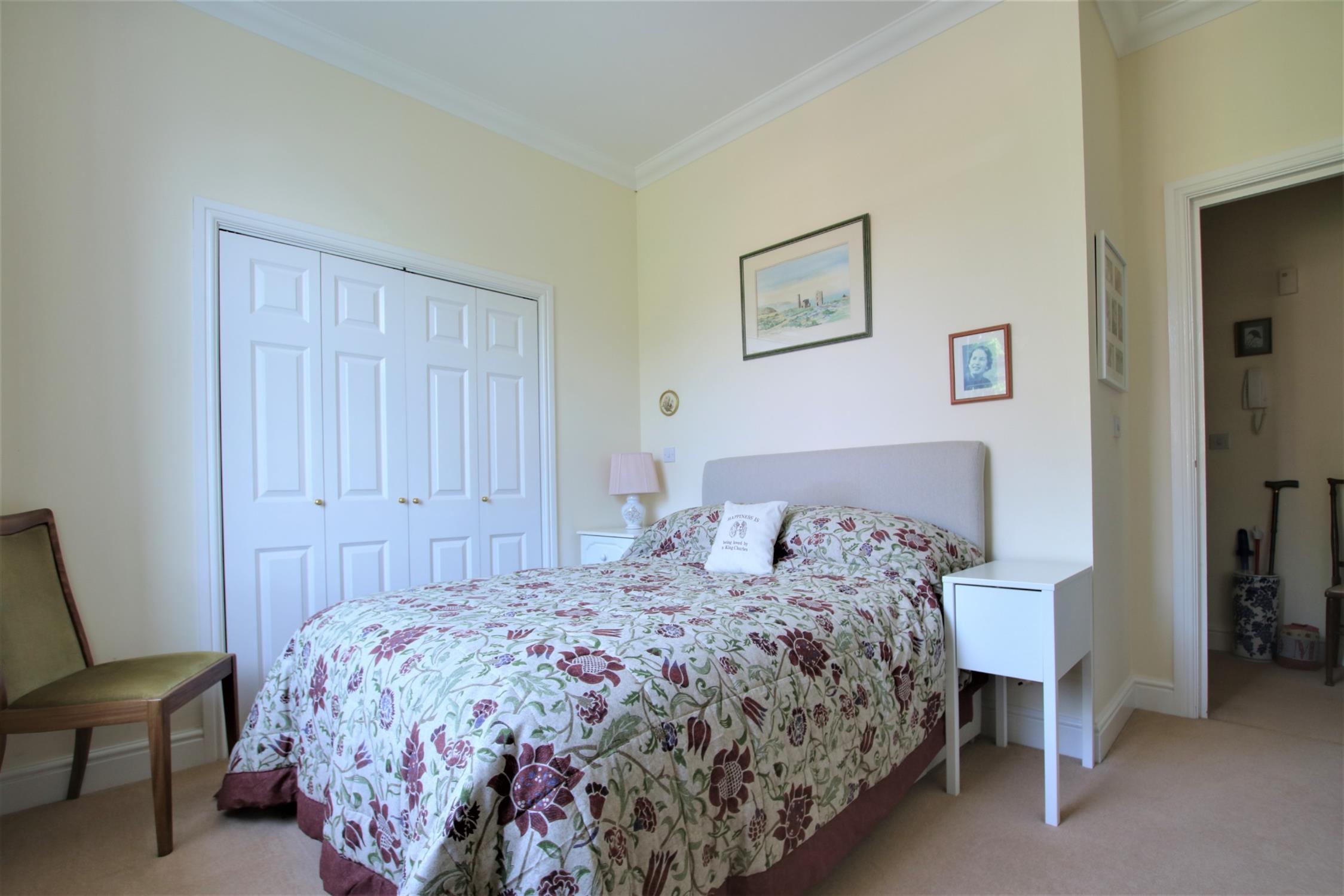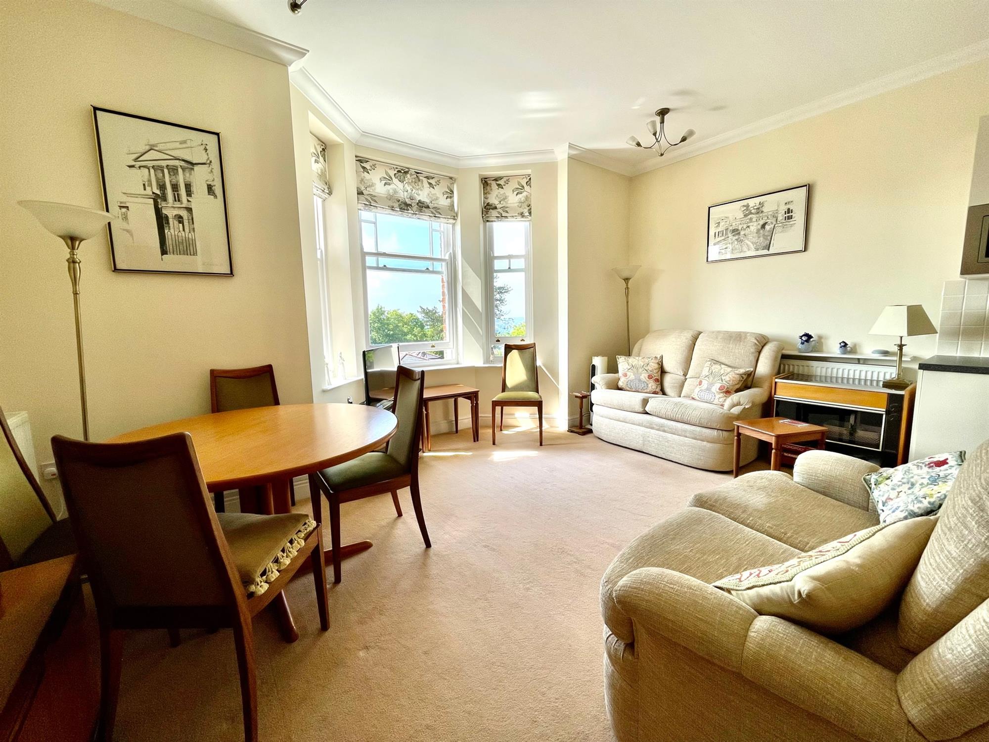 The building is accessed via a secure telecom entry system, and stairs and a lift provide access to the apartment. Upon entry, there is a spacious entrance hall with a built-in storage cupboard. The kitchen/living room is open-plan and a terrific size with ample room for both lounge and dining furniture. A large bay window allows plenty of natural light into the space and offers beautiful far-reaching views of the countryside. The kitchen is L-shape and fitted with a range of gloss white eye and low-level units with integrated appliances including double oven, electric hob, microwave and fridge/freezer. The property offers two bedrooms, both of which are doubles and offer built-in storage. Bedroom two further benefits from a characterful balcony with leafy views and plenty of space to sit. The bathroom is a white suite and is fitted with a double length shower, toilet, handbasin and heated towel rail.
