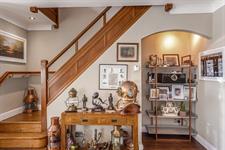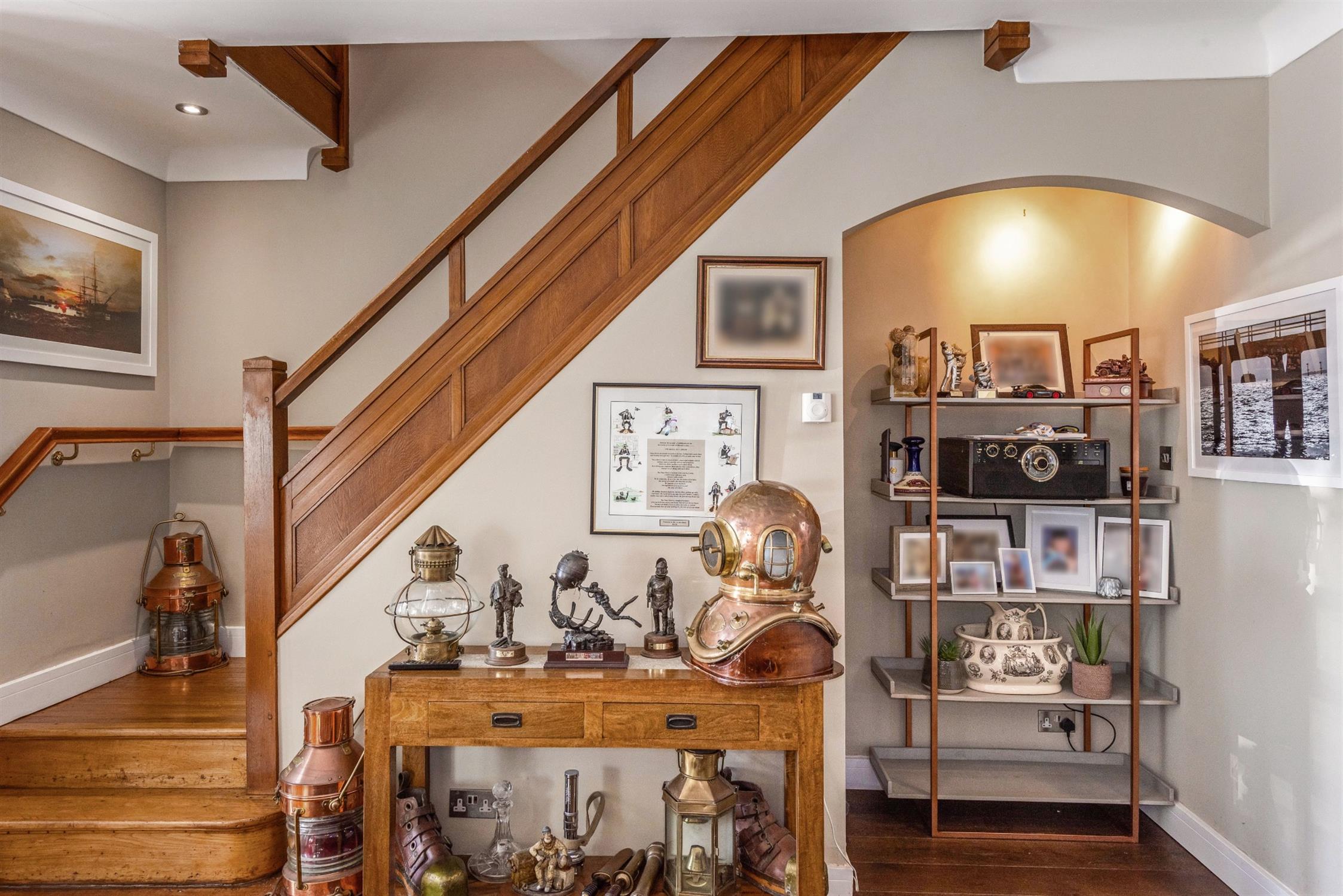 Double glazed curved bay window with fitted shutters, double glazed obscured stainless glass window to side aspect, radiator, wood burner set in fireplace, stairs to first floor, understairs storage area, steps up to: