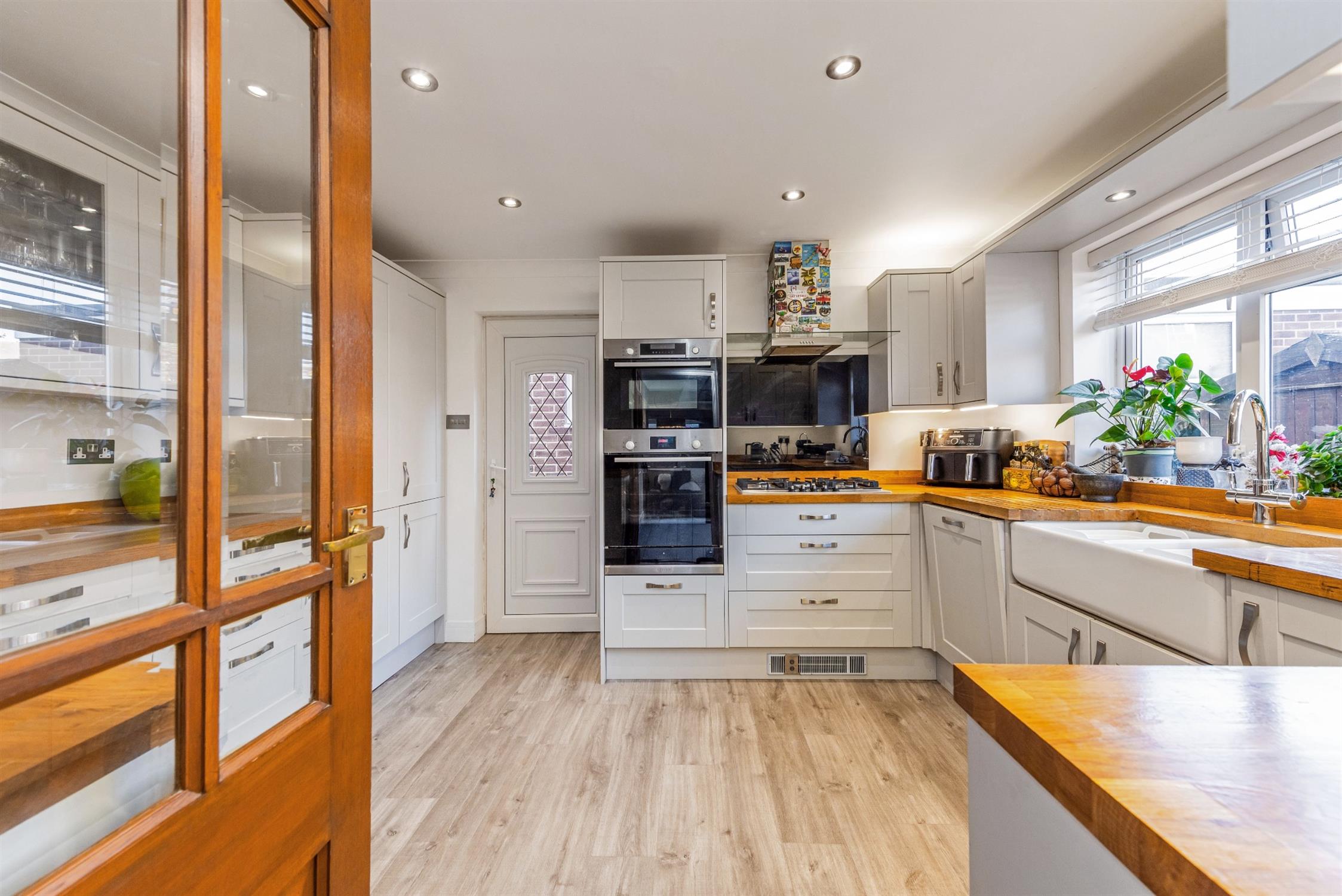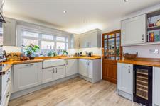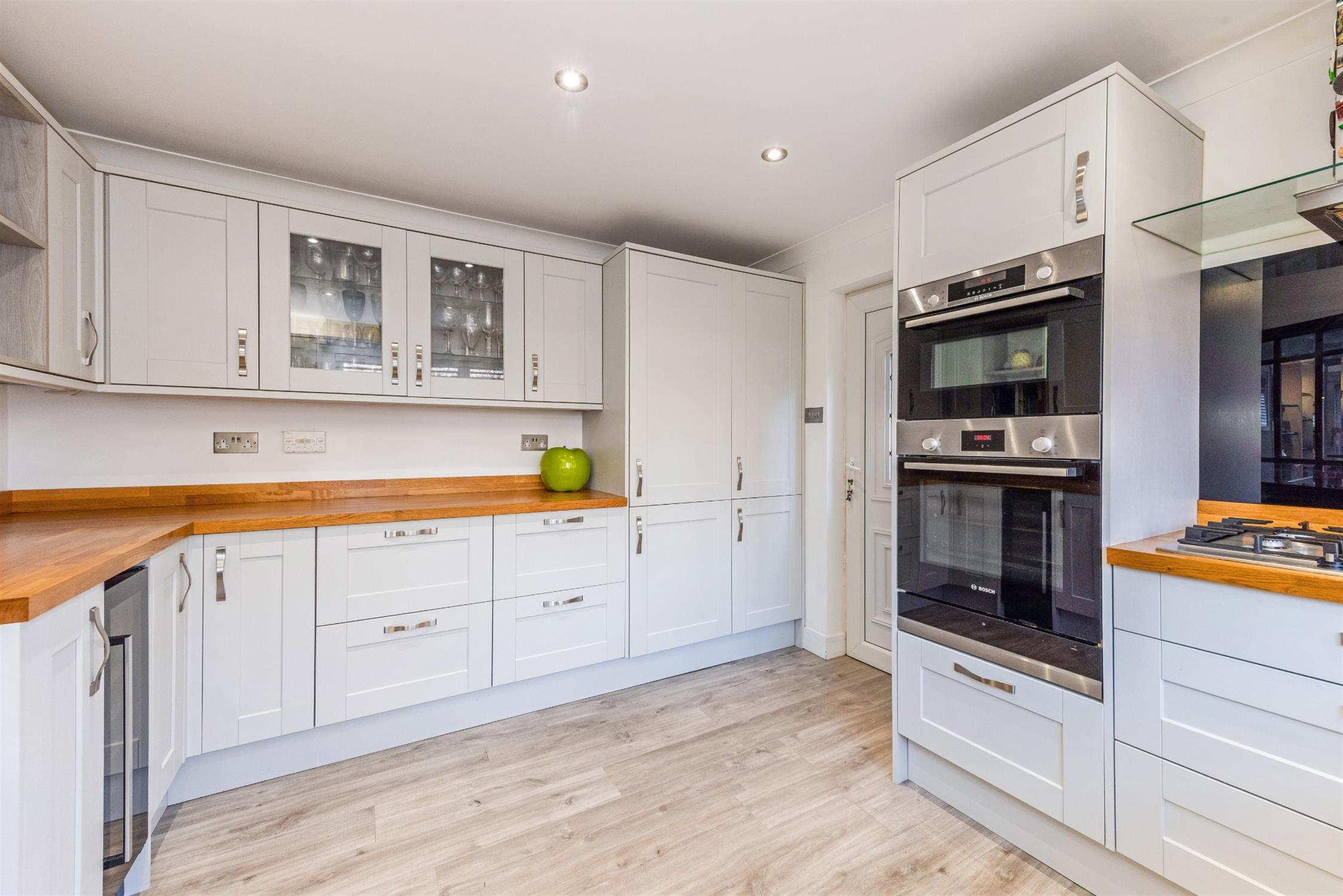Inset spotlights, double glazed window, double glazed door to side, range of wall and base mounted units with solid wood work surfaces over, inset ceramic double sink with boiling hot and filtered water tap over, integrated appliances including fridge freezer, wine cooler, washing machine, dishwasher, double electric oven and 5-ring gas hob with extractor fan over.