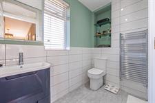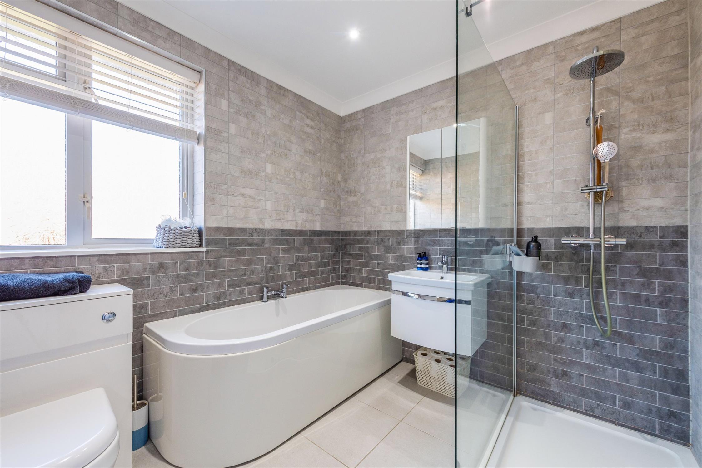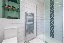 Coved ceiling, double glazed obscured window, panelled bath, walk in shower, WC, wash hand basin with cupboards beneath, tall ladder radiator, underfloor heating, tiled floor, tiled walls.