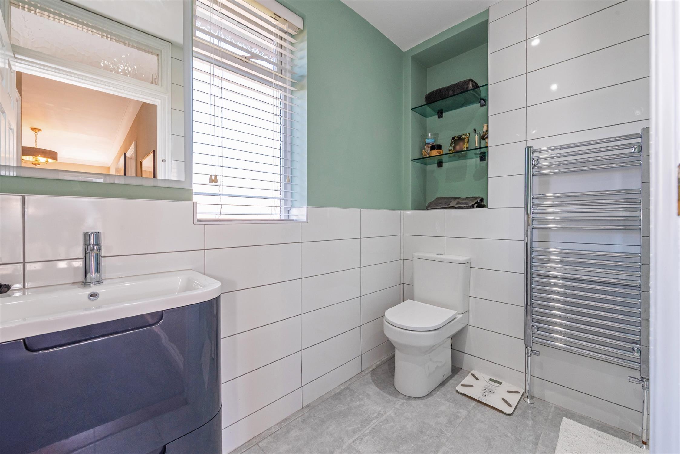 Inset spotlights, double glazed obscured window, extractor fan, WC, wash hand basin with drawers beneath, shower cubicle, ladder radiator, recessed shelving, part tiled walls, tiled floor.