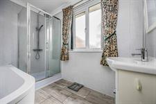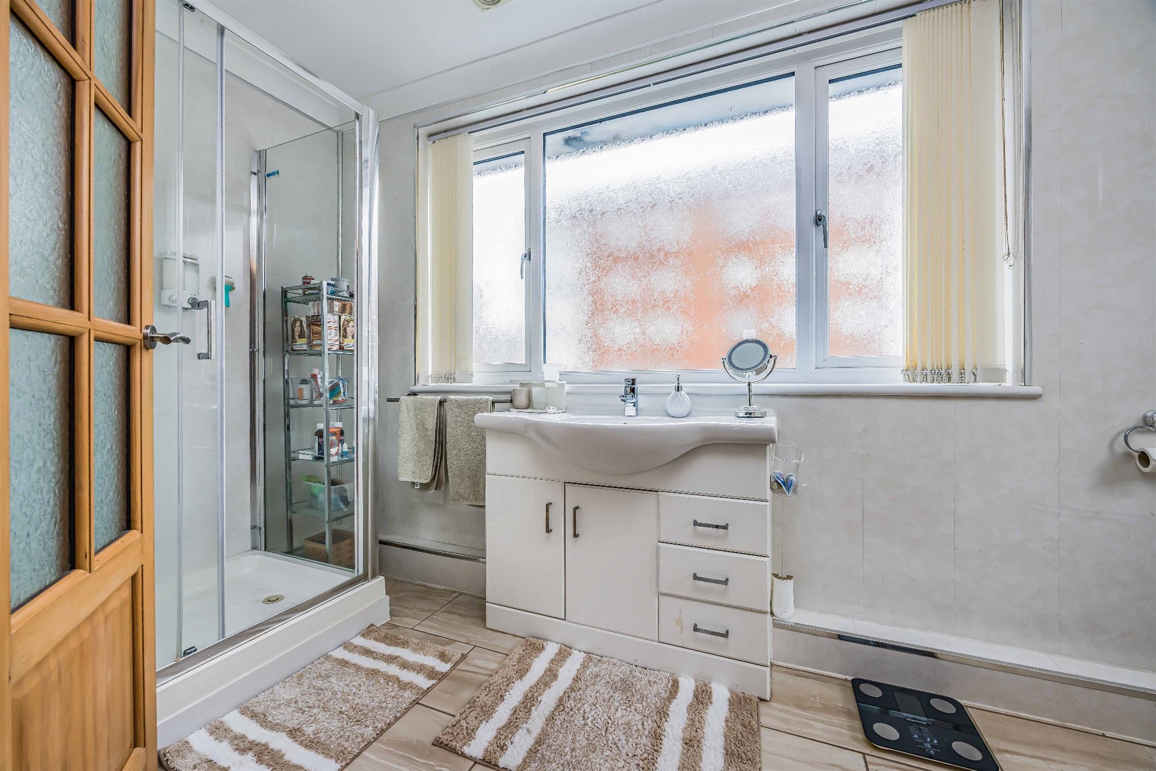 Coved ceiling, inset spotlights, two triple glazed obscured windows, shower cubicle, WC, wash hand basin with cupboards beneath, ladder radiator, aqua panelling, tiled floor.