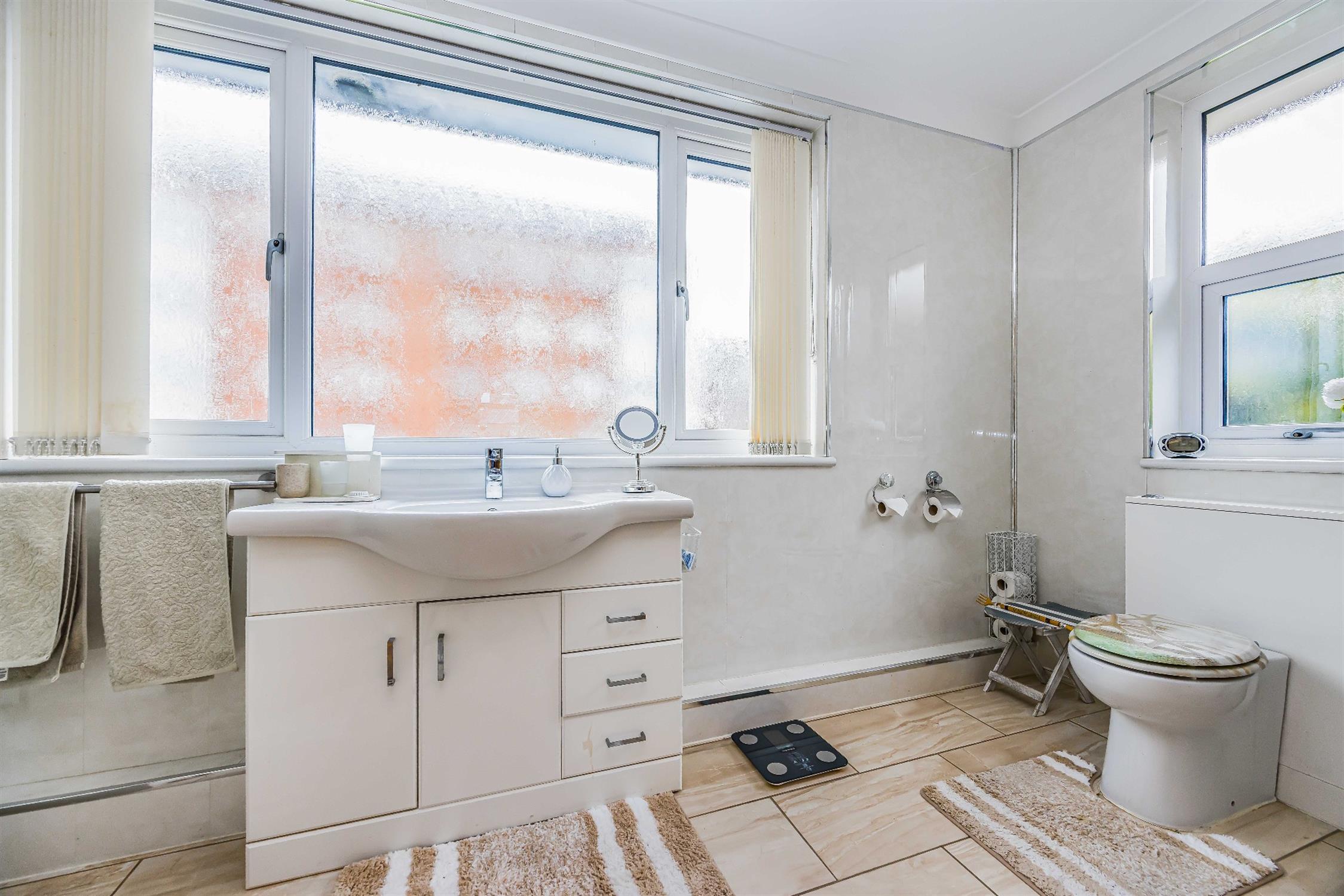 Coved ceiling, triple glazed obscured window, WC, wash hand basin with cupboards beneath, ladder radiator, tiled floor.