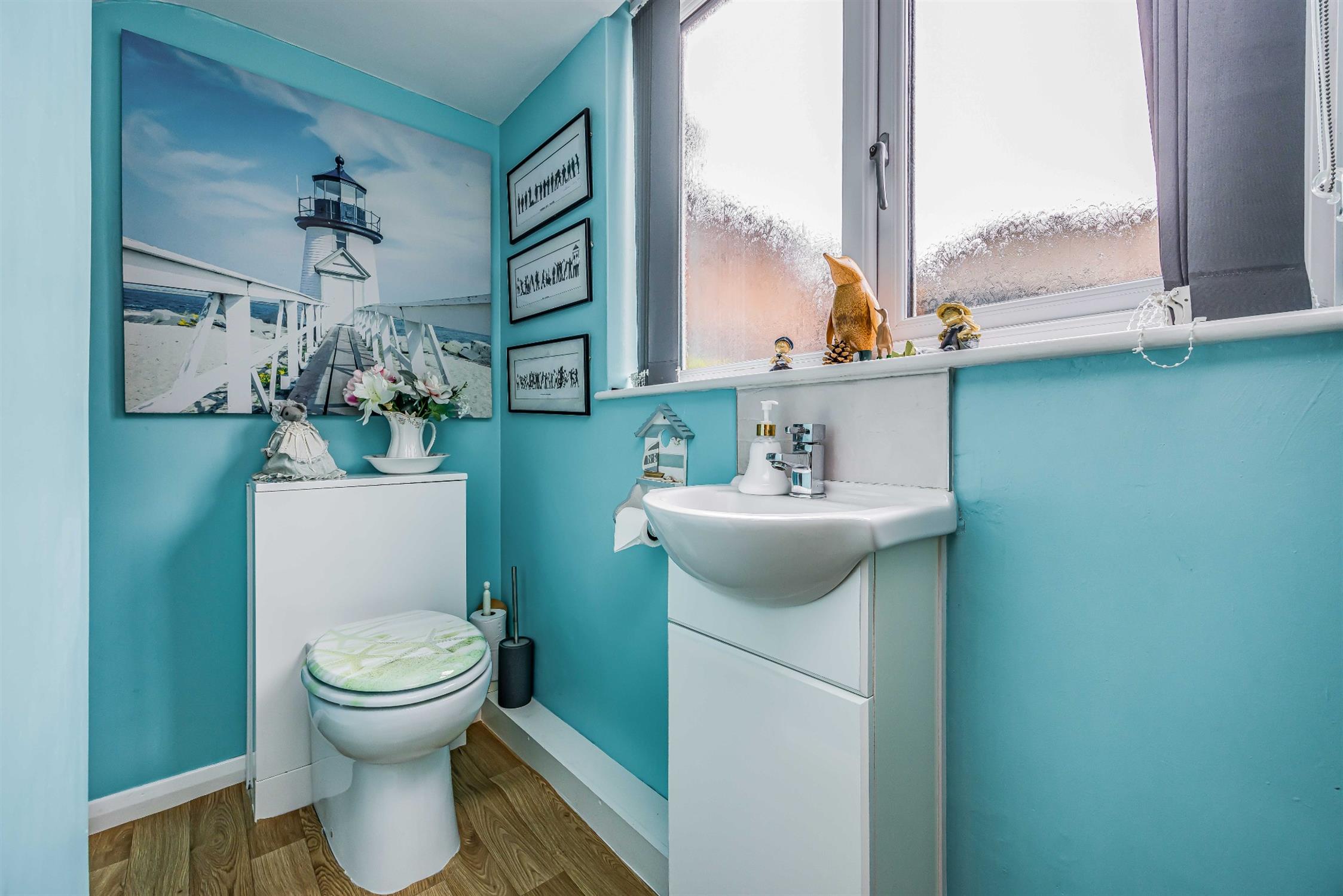 Inset spotlights, triple glazed obscured window, WC, wash hand basin with cupboards beneath, ladder radiator, storage cupboard, vinyl flooring.