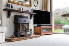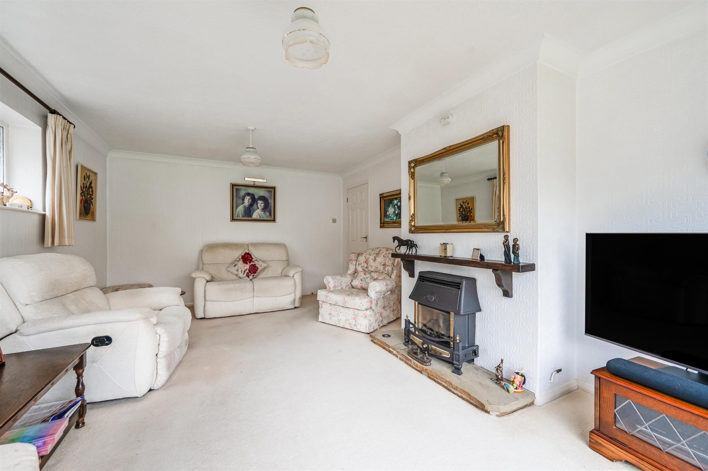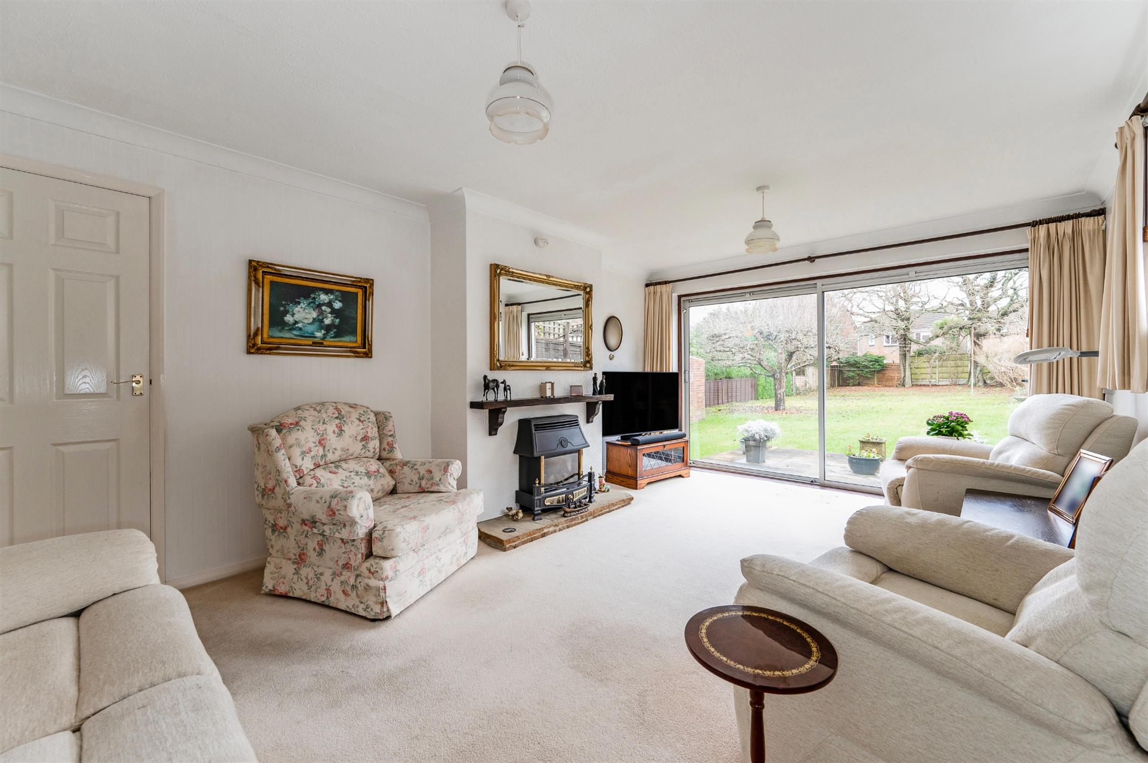 Sliding patio door opening to the rear garden. Obscured window to the side. Feature fireplace with fitted gas fire on stone hearth beneath a wooden mantle. Radiator.