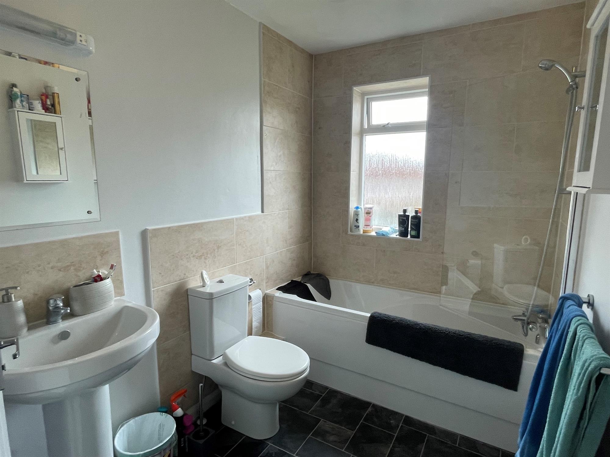 BATHROOM - White suite bathroom with shower over bath, sink and toilet. Window to rear.