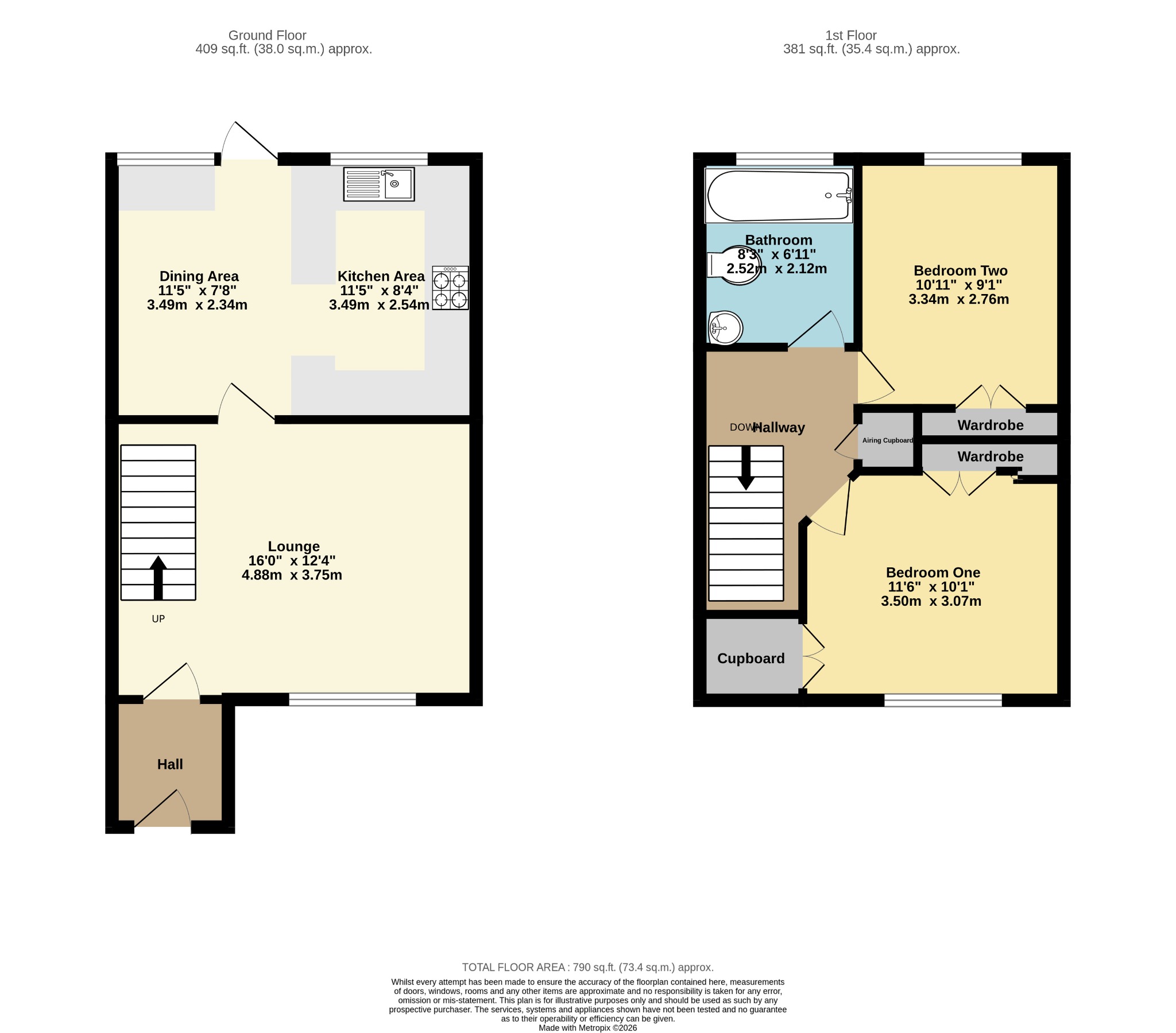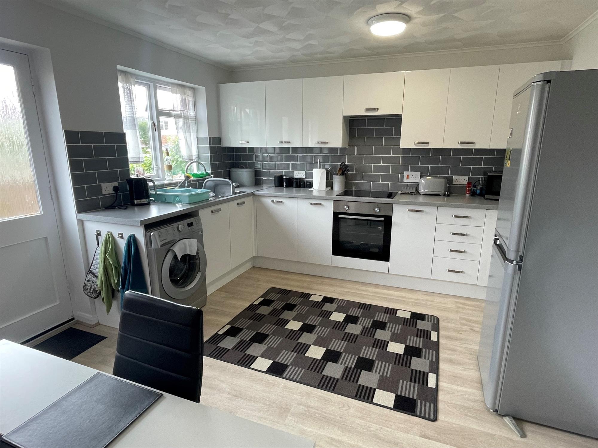 KITCHEN/DINER – White gloss kitchen with various wall and base units. Appliances consist of electric hob and electric oven. Spaces for the washing machine and fridge/freezer although these will not be supplied. Space in the diner area for table and chairs. 2 windows and door to back garden.