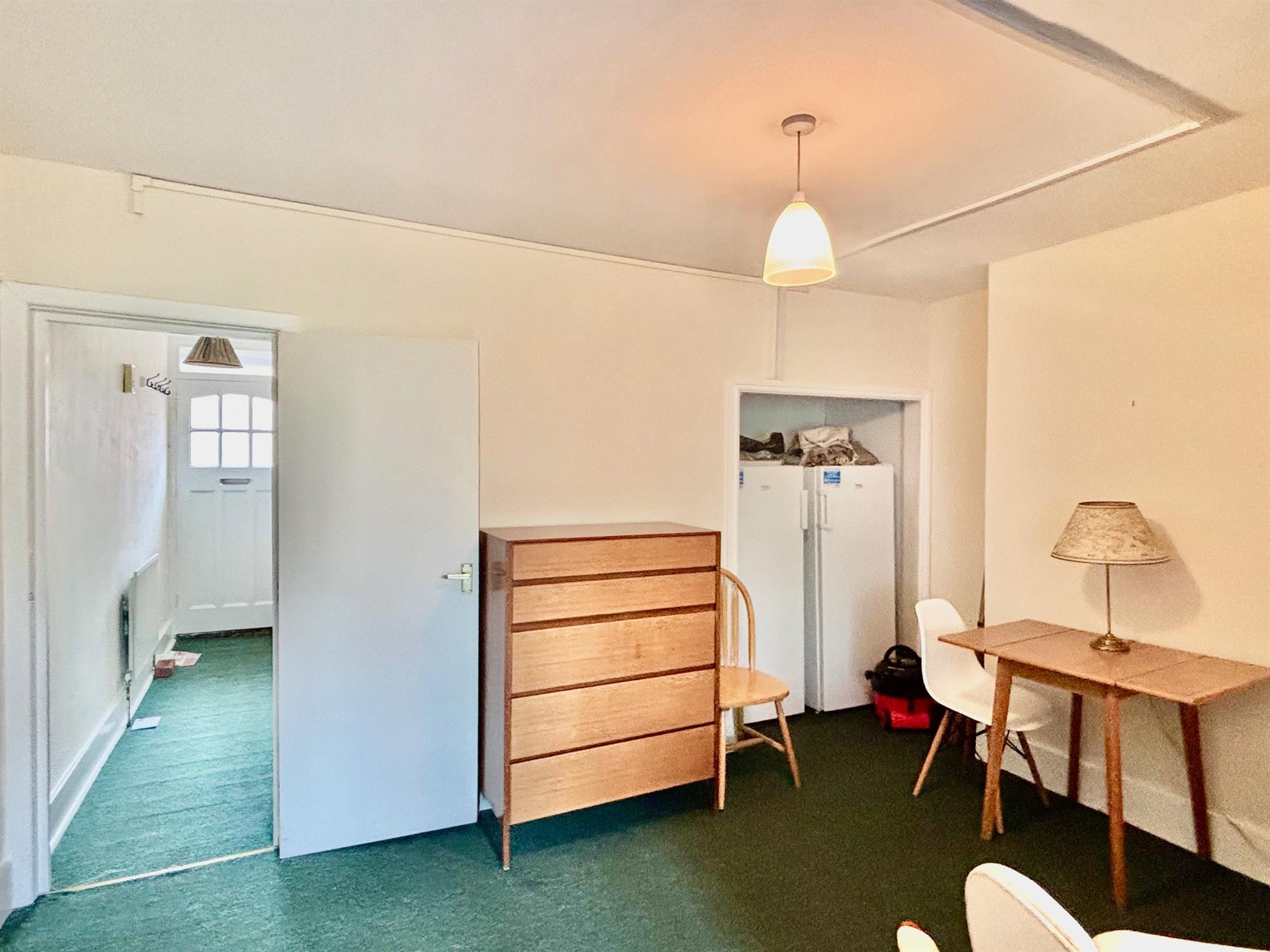 Adjacent to the kitchen, the dining room is the width of the building, with storage cupboard under the stairs.