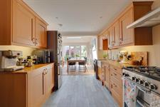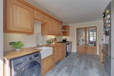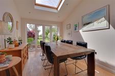 A range of wall and base units with hardtop work surfaces over, space for a range-style cooker, washing machine and fridge/freezer, under-stairs pantry cupboard, butler-style ceramic sink with mixer tap over, and Italian tiled flooring by Fired Earth. The kitchen is open plan to the dining area, which has oak veneer flooring, radiator, Velux window, and double-glazed French doors opening onto the rear garden.