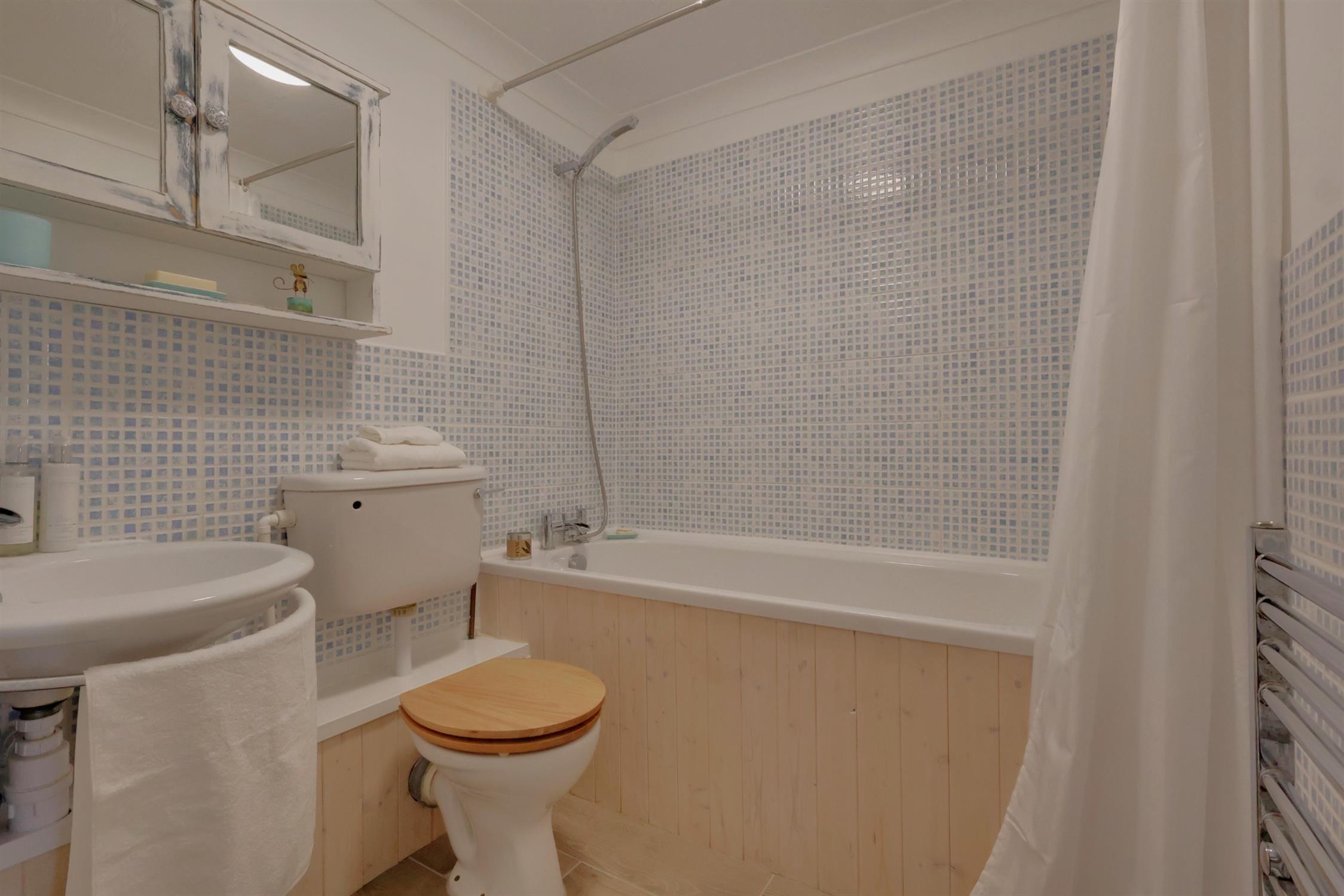 Comprises of a three-piece suite including a panel-enclosed bath with shower attachment off of the taps, a circular wall-mounted ceramic wash hand basin, low-level WC, ladder-style radiator, extractor fan, and part-tiled walls.