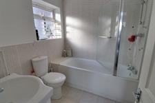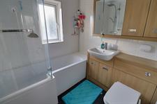 Double glazed window to side, hand basin with mixer tap, W.C, panel enclosed bath with shower over, towel radiator, tiled splash backs, loft hatch.