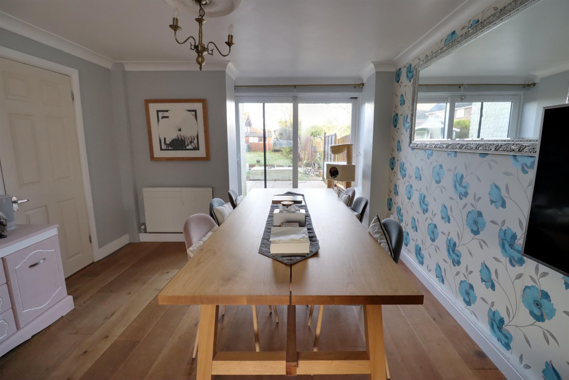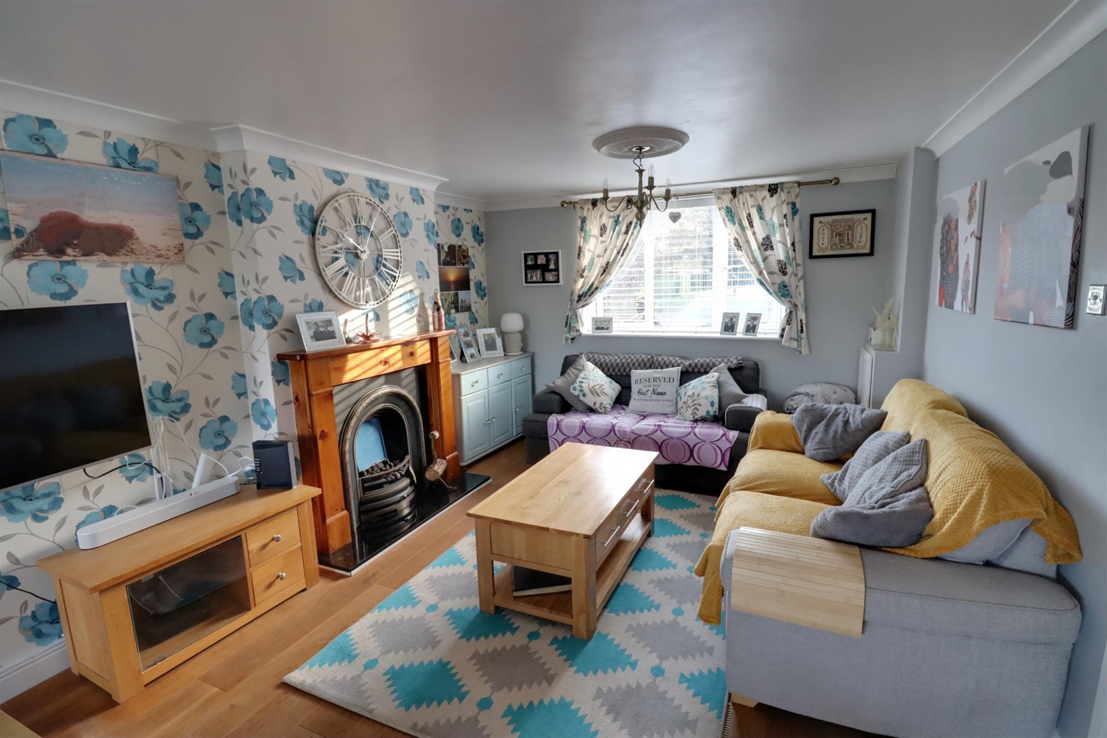 Double glazed window to front, double glazed sliding patio doors to garden, solid timber flooring, inset gas fire with timber surround and stone hearth, T.V point, telephone, two radiators.