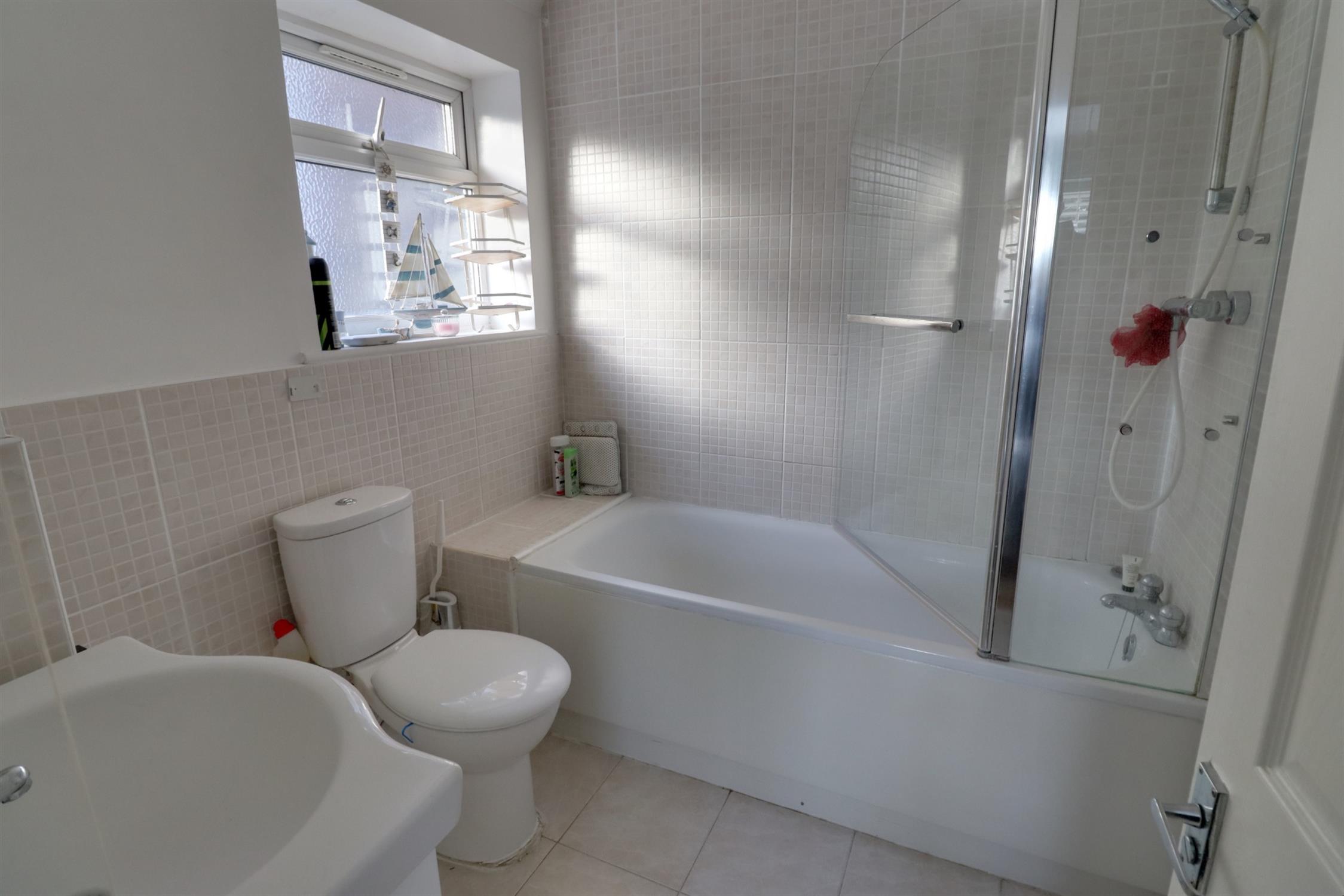 Opaque double glazed window to rear, panel enclosed shower/bath with rainfall shower head and shower attachment, wash hand basin, W.C, tiled splash backs, towel radiator.