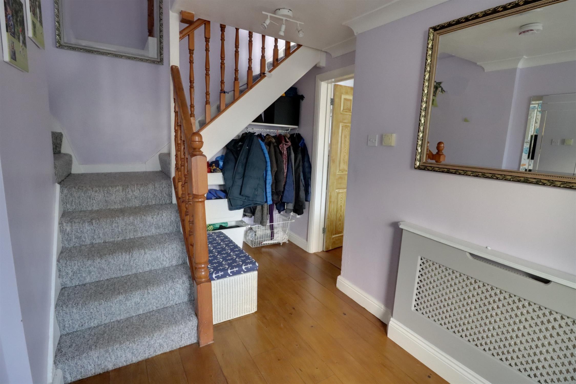 Opaque double glazed door and side windows, stairs to first floor, solid timber flooring, radiator, understairs storage.